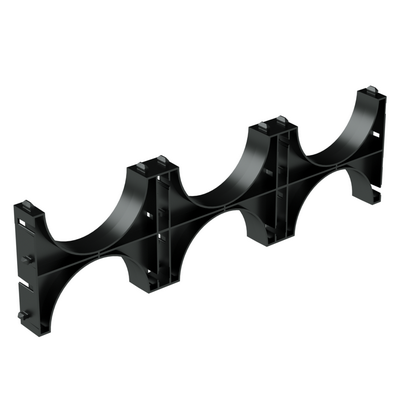 Назначение держателя расстояния (кластера) для двустенных труб - закрепление труб в определенном положении и сохранение между ними фиксированного расстояния. Кластер имеет пазы для трех труб диаметром 125 мм. Если необходимо, кластеры могут быть соединены между собой, чтобы разместить большее количество труб.