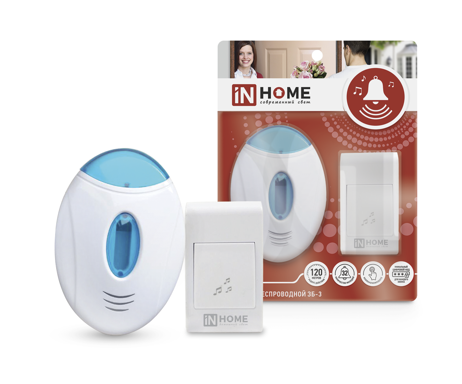 Звонок беспроводной ЗБ-3 32 мелодии 120м с подсветкой с кнопкой бело-голубой IN HOME