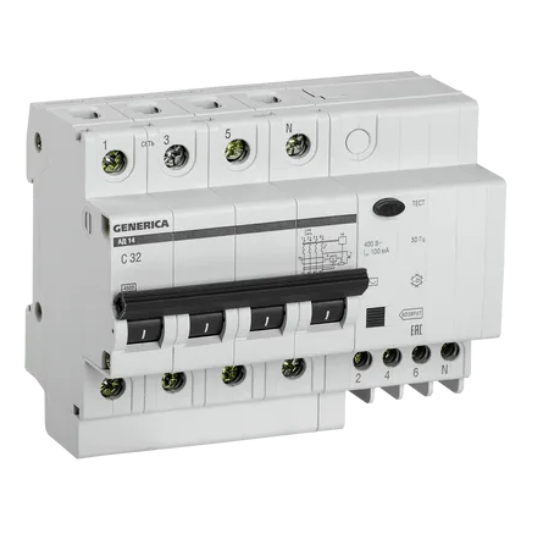 IEK Дифференциальный автоматический выключатель АД14 4Р 32А 100мА GENERICA - MAD15-4-032-C-100 имеет тепловой и электромагнитный расцепители и винтовое соединение. Он также имеет индикацию срабатывания от дифференциального тока и соответствует стандартам IEC 61009-1 и EN 60898.