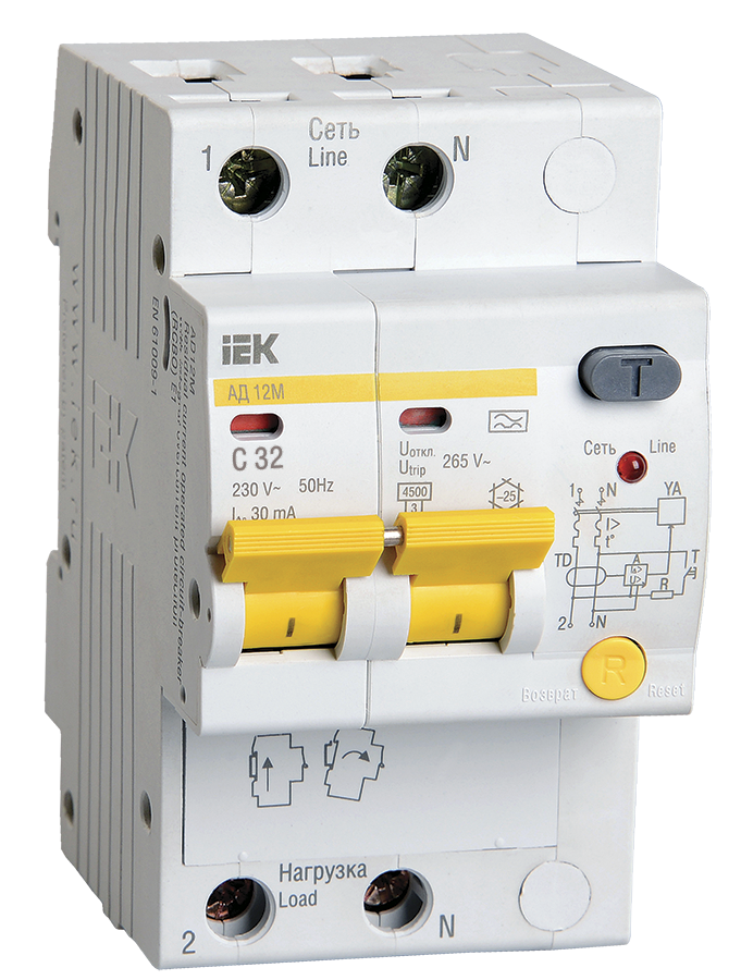 В изделиях предусмотрена индикация срабатывания от дифференциального тока, а для АД12М также светодиодная индикация включенного состояния. АД12М сохраняет работоспособность при снижении напряжения электрической сети до 110 В.