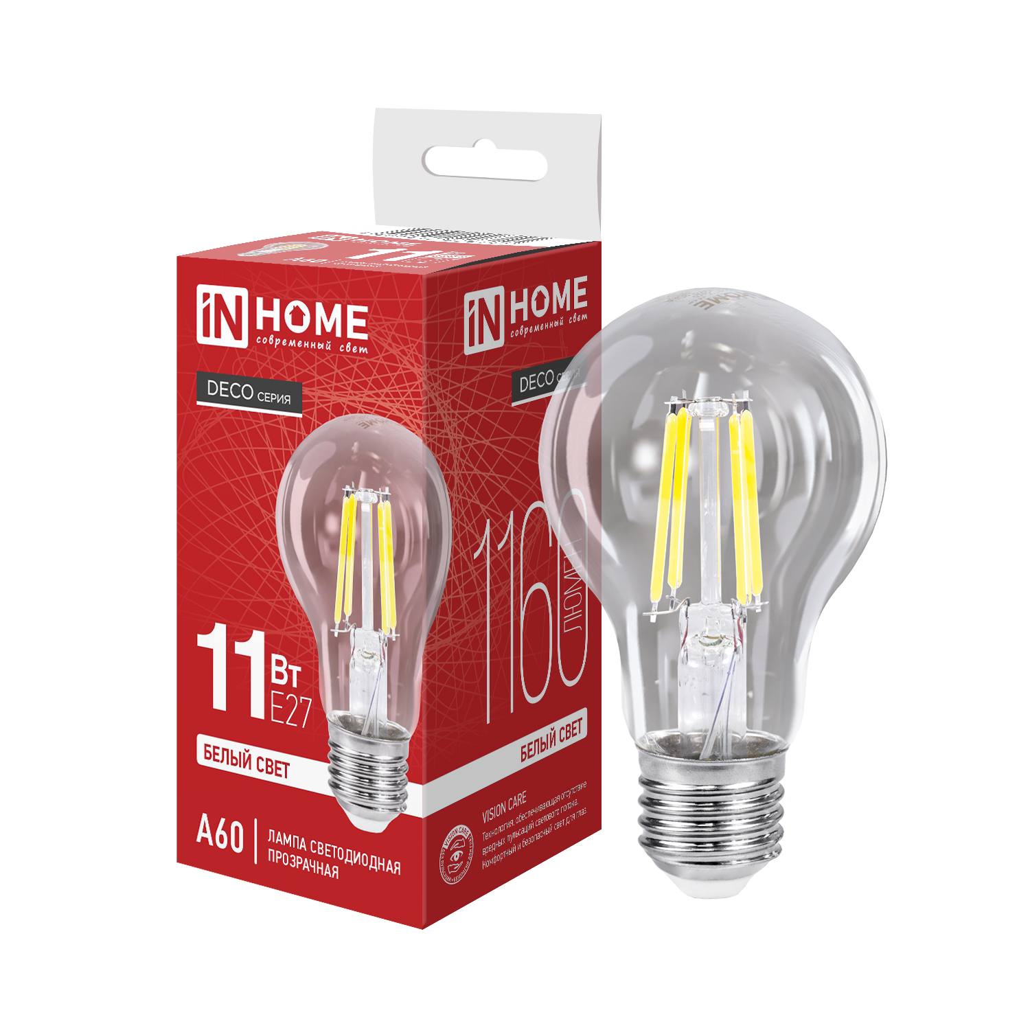 Лампа светодиодная LED-A60-deco 11Вт 230В Е27 4000К 1160Лм прозрачная IN HOME