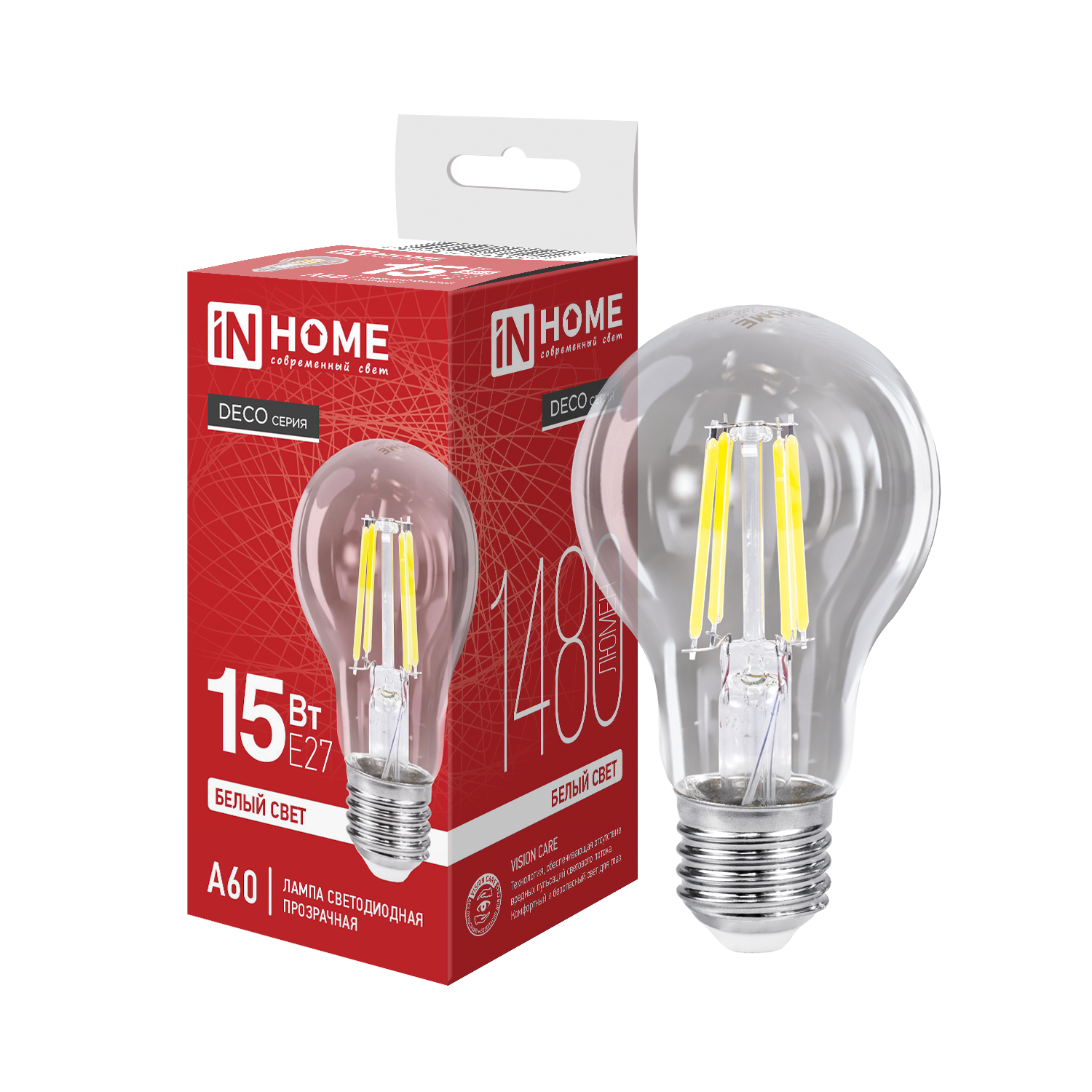 Лампа светодиодная LED-A60-deco 15Вт 230В Е27 4000К 1480Лм прозрачная IN HOME