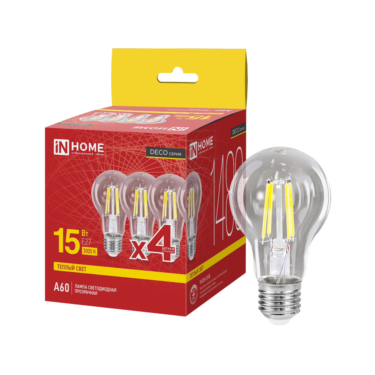 Лампа светодиодная LED-A60-deco 4PACK 15Вт 230В Е27 3000К 1480Лм (4шт./упак) прозрачная IN HOME