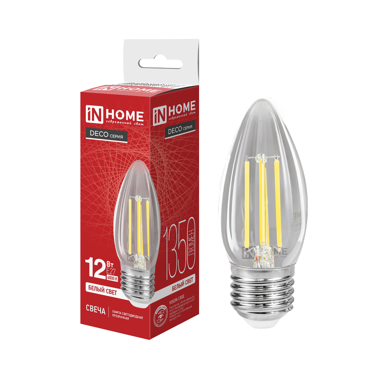 Лампа светодиодная LED-СВЕЧА-deco 12Вт 230В Е27 4000К 1350Лм прозрачная IN HOME