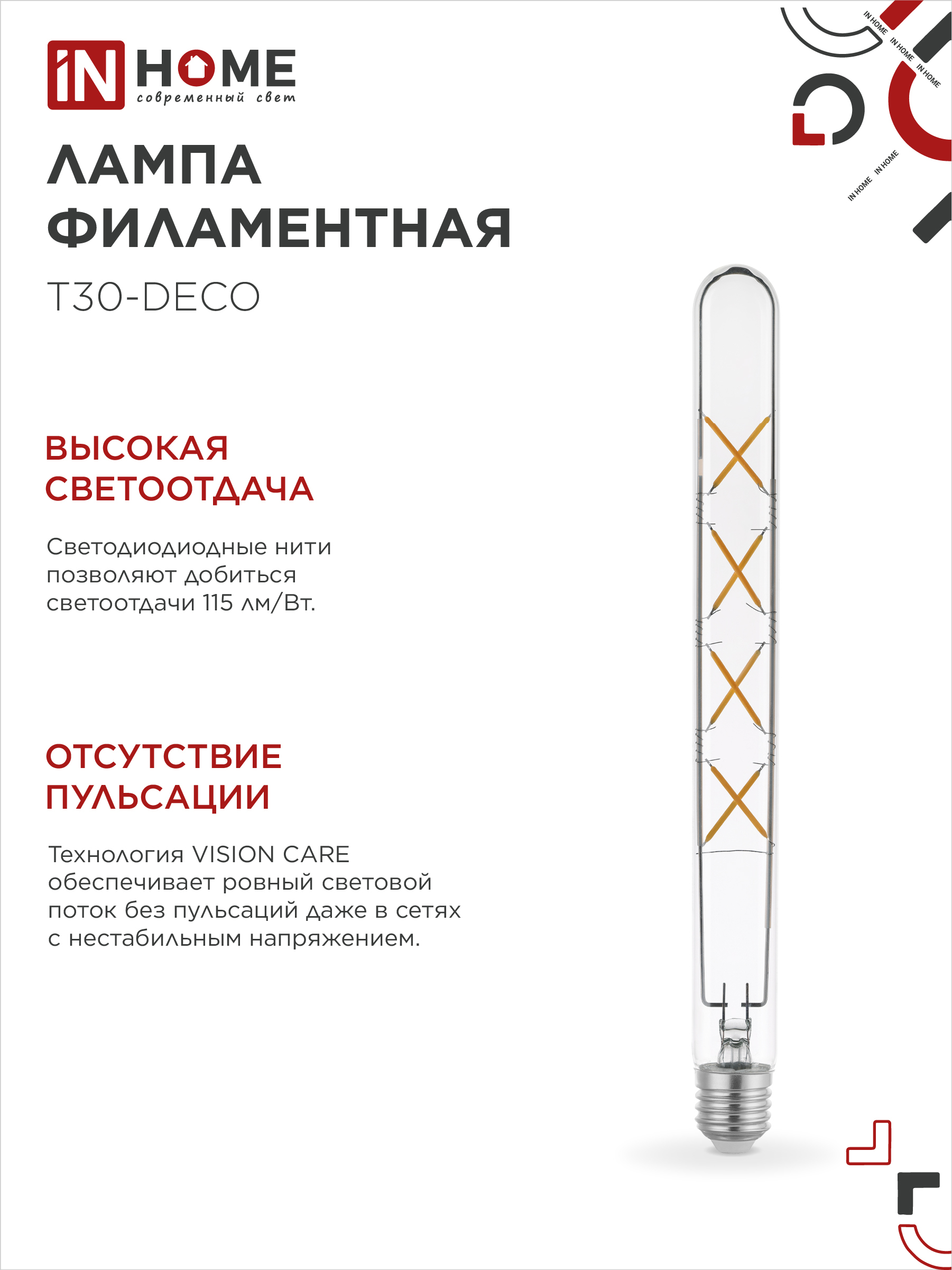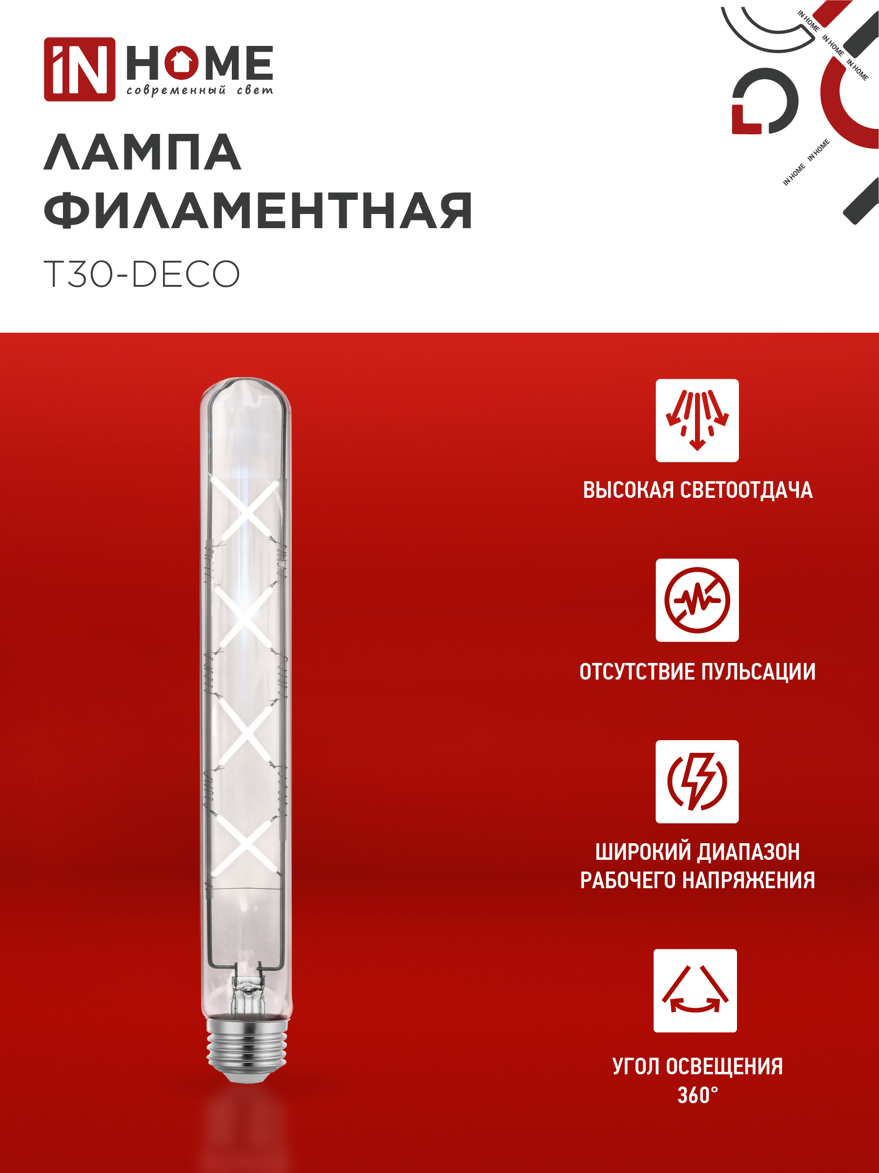 Лампа светодиодная LED-T30-deco 11Вт 230В Е27 4000К 1270Лм 300мм прозрачная IN HOME