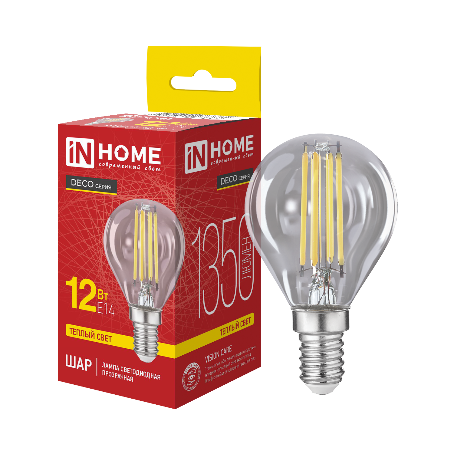Лампа светодионая LED-ШАР-deco 12Вт 230В Е14 3000К 1350Лм прозрачная IN HOME