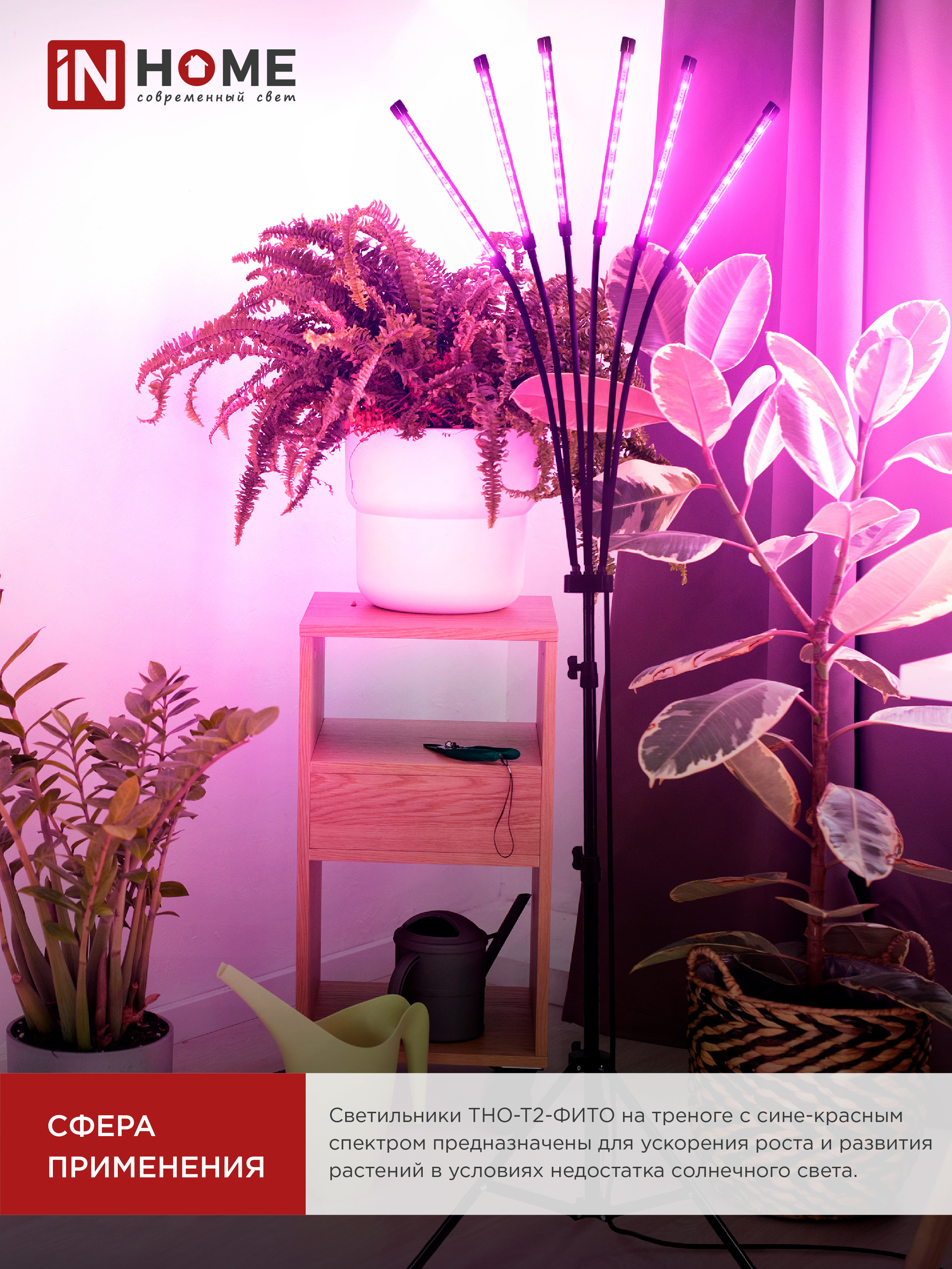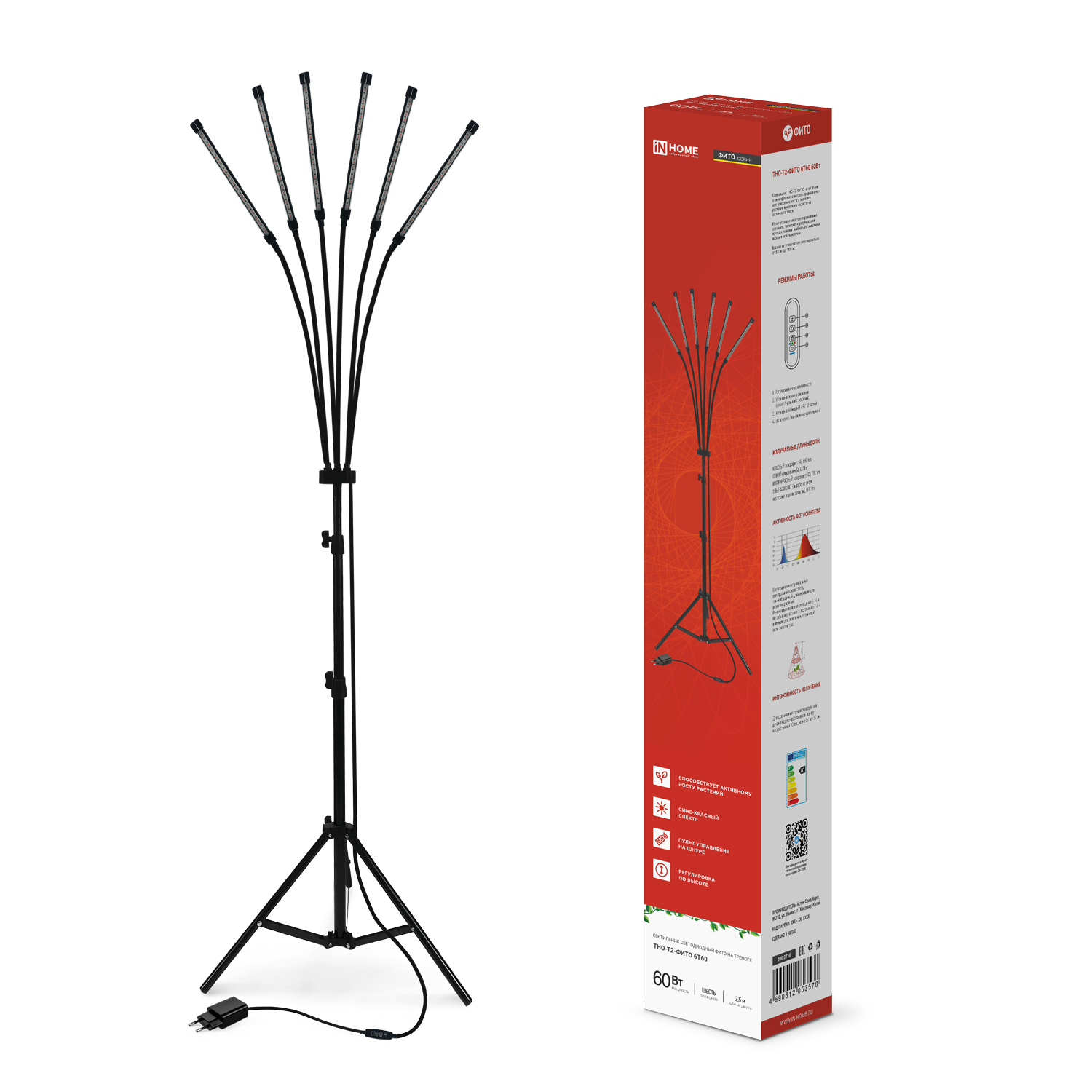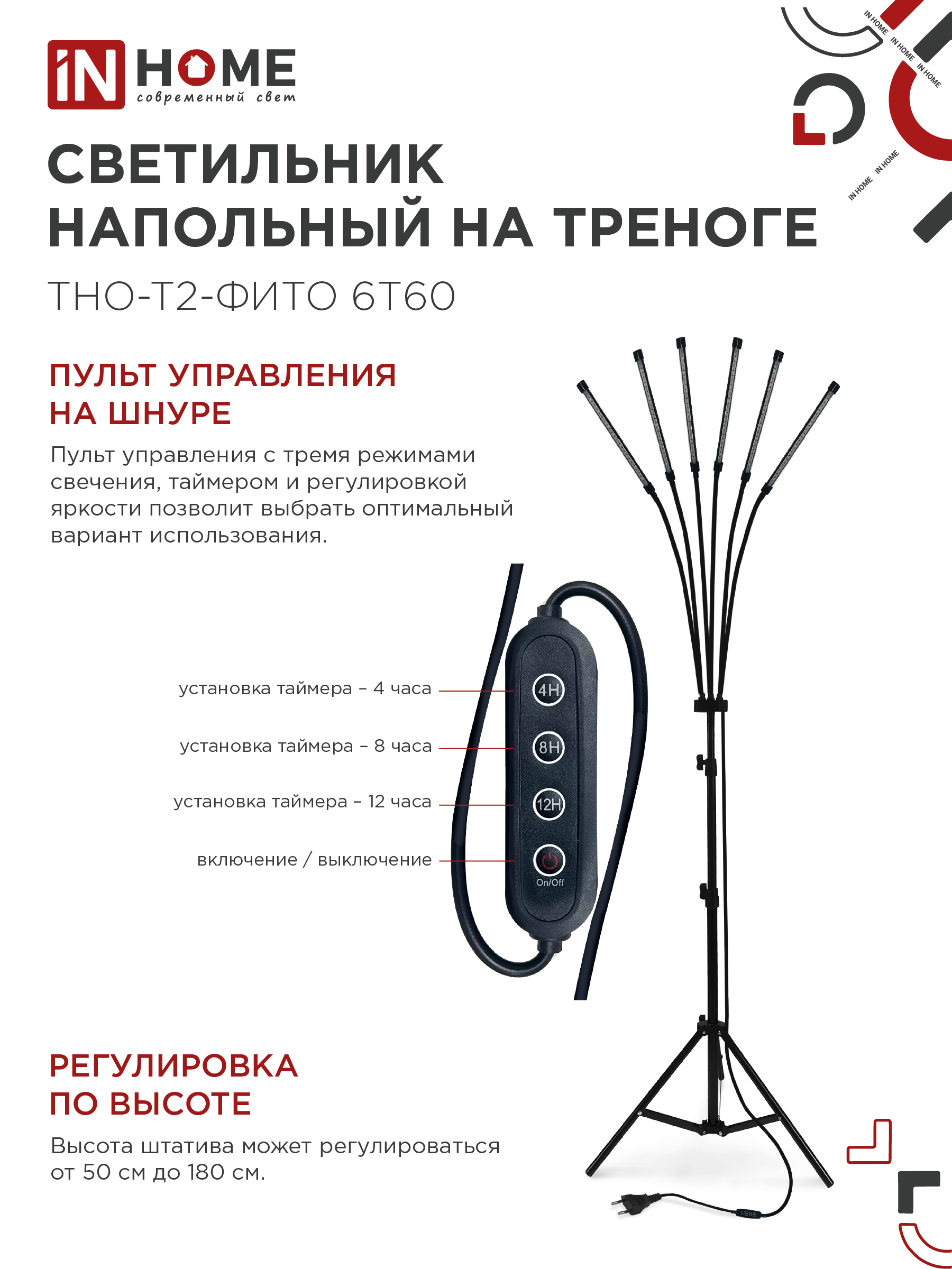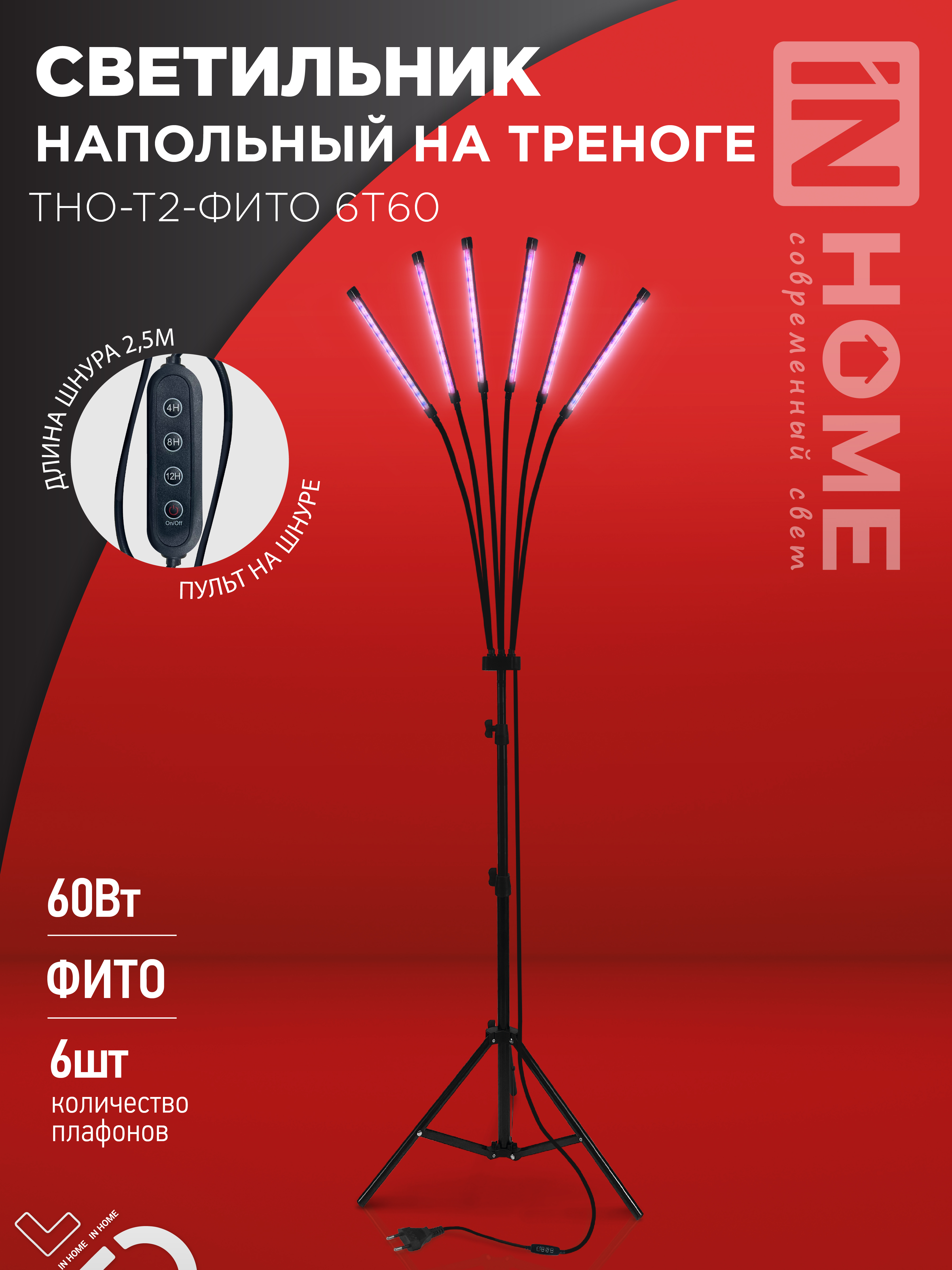 Светильник напольный на треноге светодиодный ТНО-Т2-ФИТО 6Т60 60Вт 6 плафонов, пульт на шнуре ЧЕРНЫЙ IN HOME