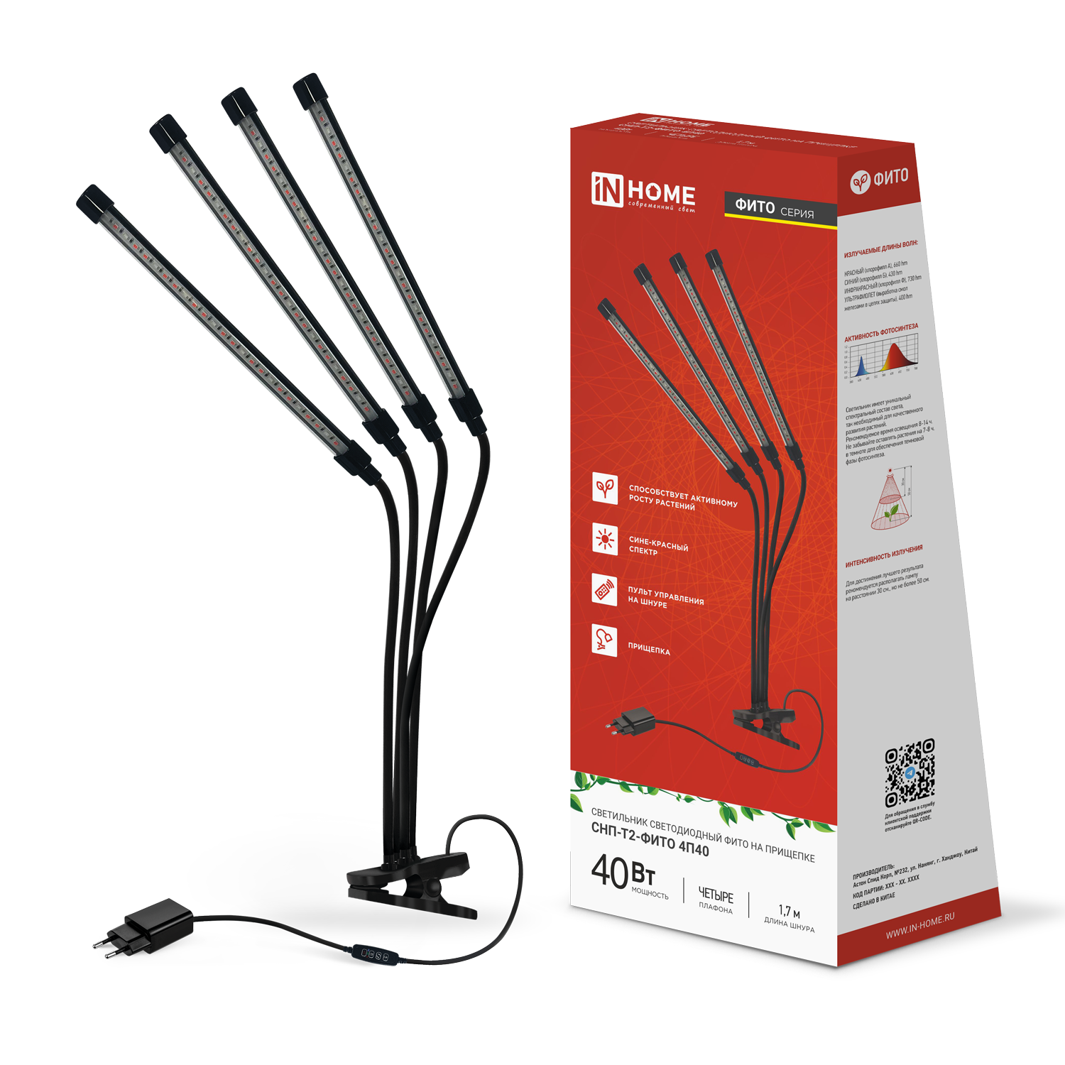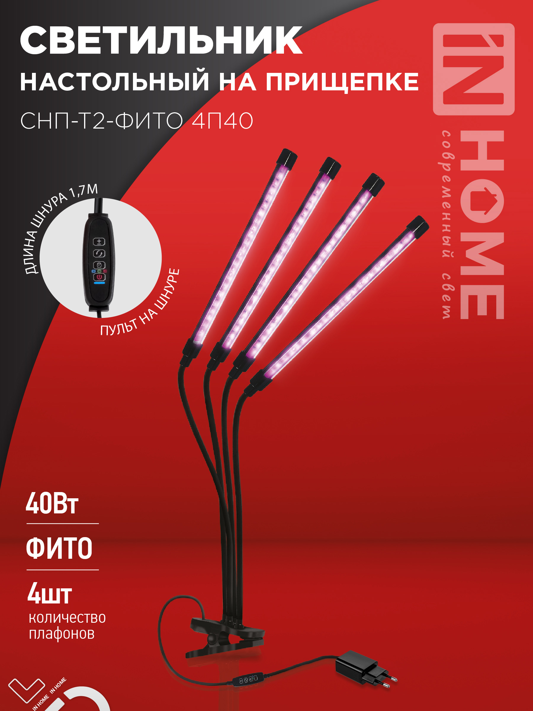 Светильник настольный на прищепке светодиодный СНП-Т2-ФИТО 4П40 40Вт 4 плафона, пульт на шнуре ЧЕРНЫЙ IN HOME