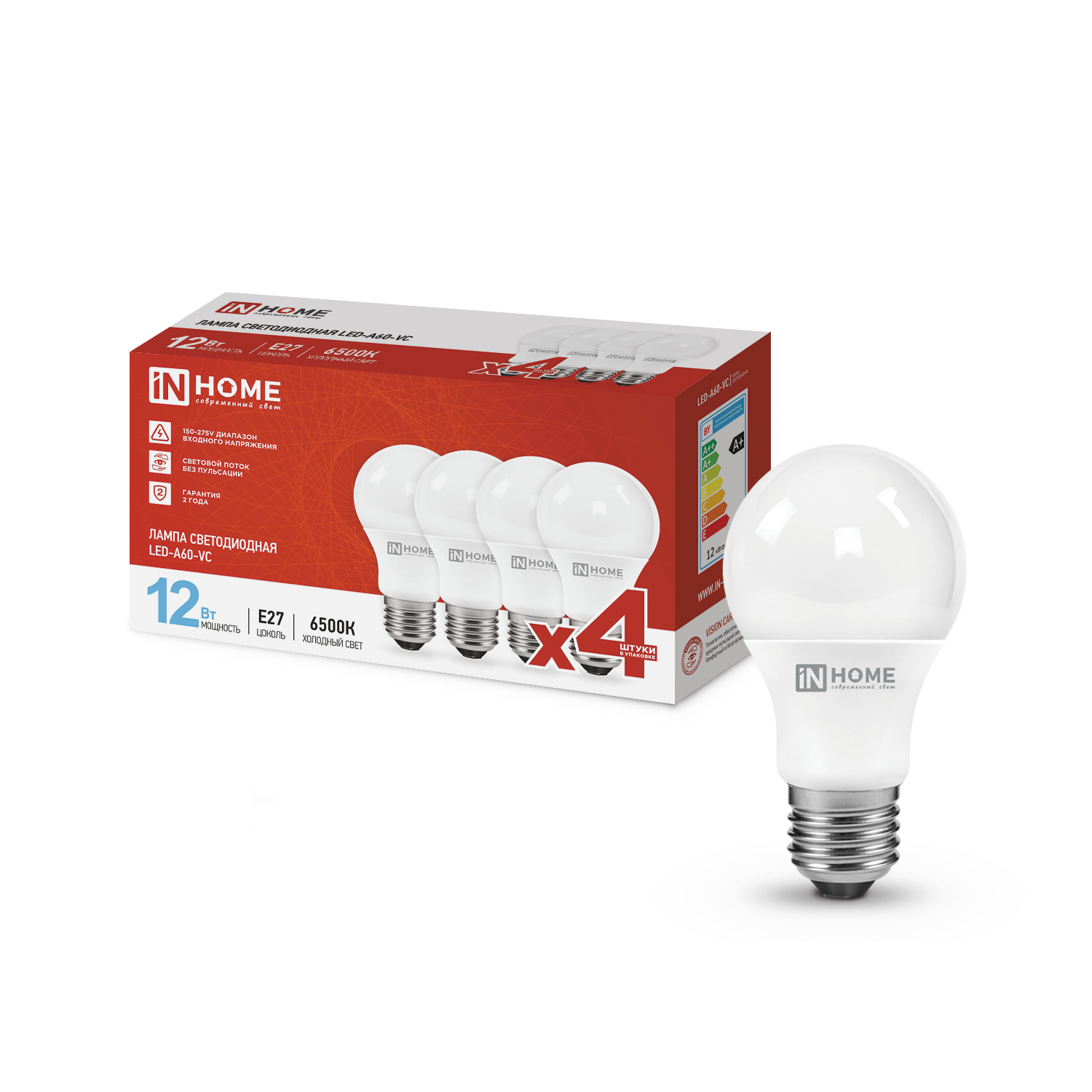 Лампа светодиодная LED-A60-VC 4PACK 12Вт 230В Е27 6500К 1140Лм (4шт./упак) IN HOME