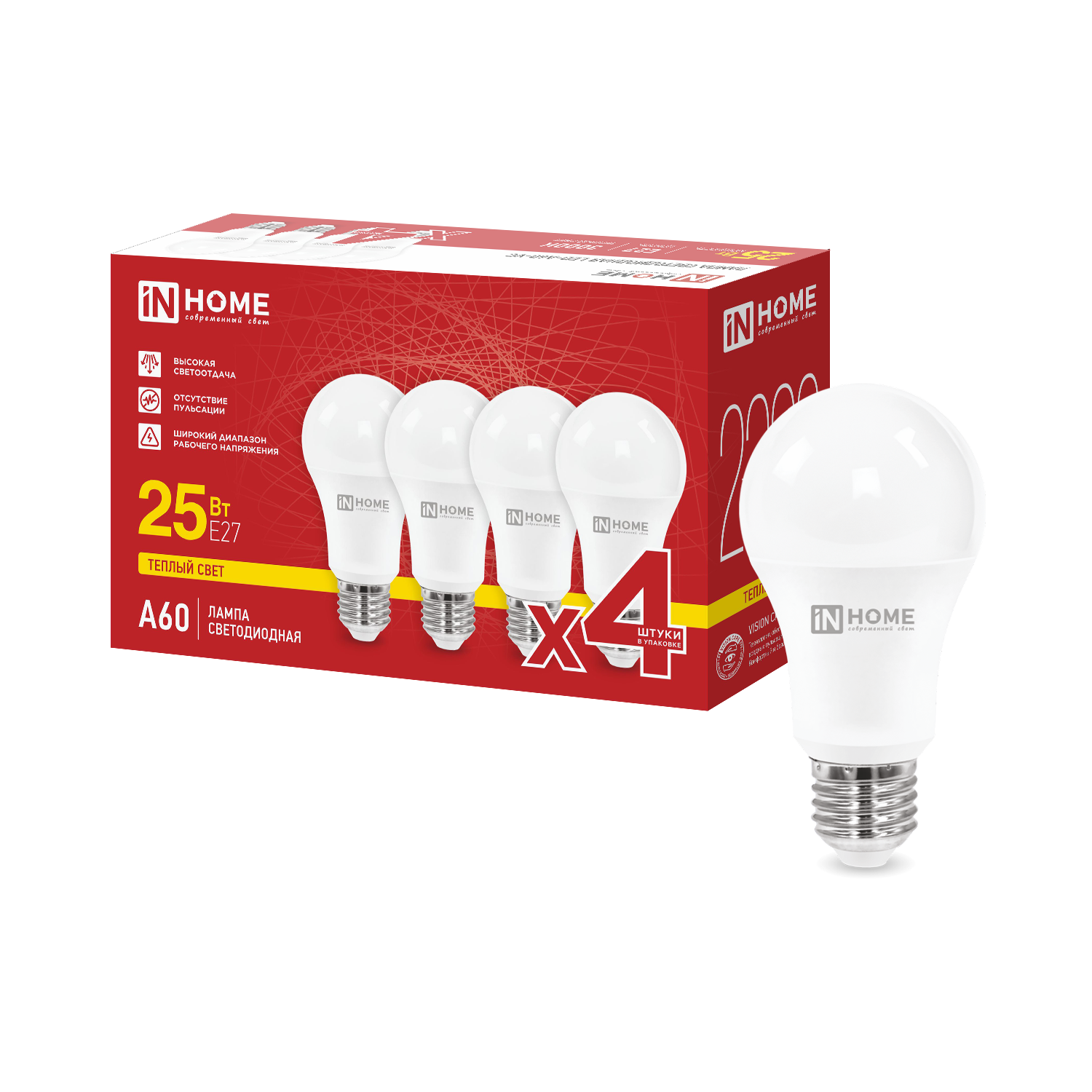 Лампа светодиодная LED-A60-VC 4PACK 25Вт 230В Е27 3000К 2380Лм (4шт./упак) IN HOME