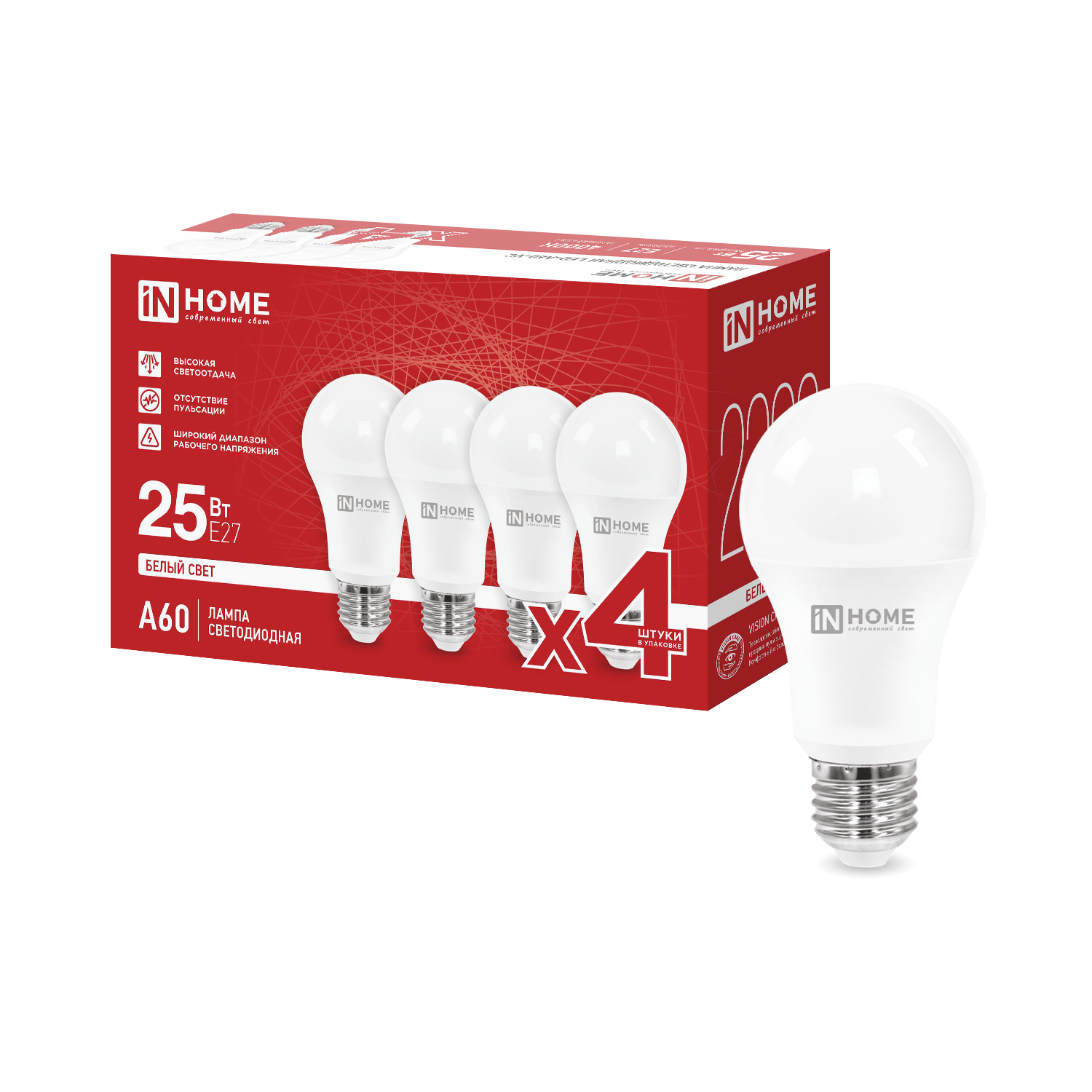 Лампа светодиодная LED-A60-VC 4PACK 25Вт 230В Е27 4000К 2380Лм (4шт./упак) IN HOME