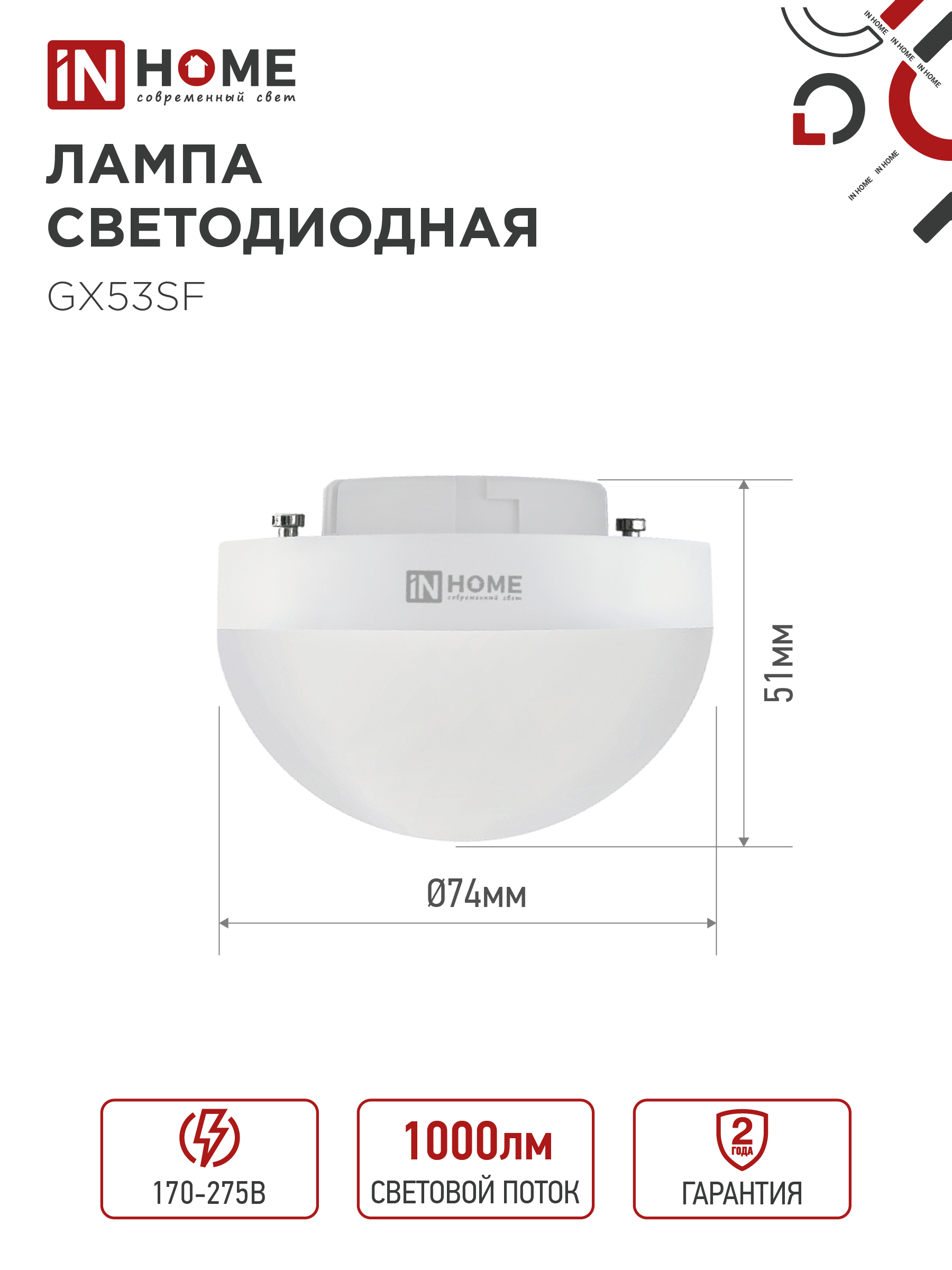 Лампа светодиодная LED-GX53SF-VC 10Вт 230В 4000K 1000Лм IN HOME