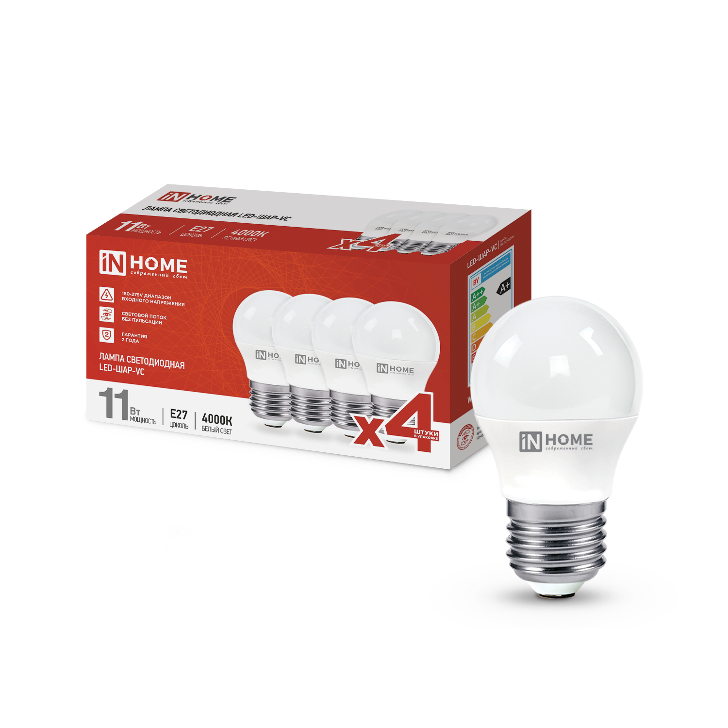 Лампа светодиодная LED-ШАР-VC 4PACK 11Вт 230В Е27 4000К 1050Лм (4шт./упак) IN HOME