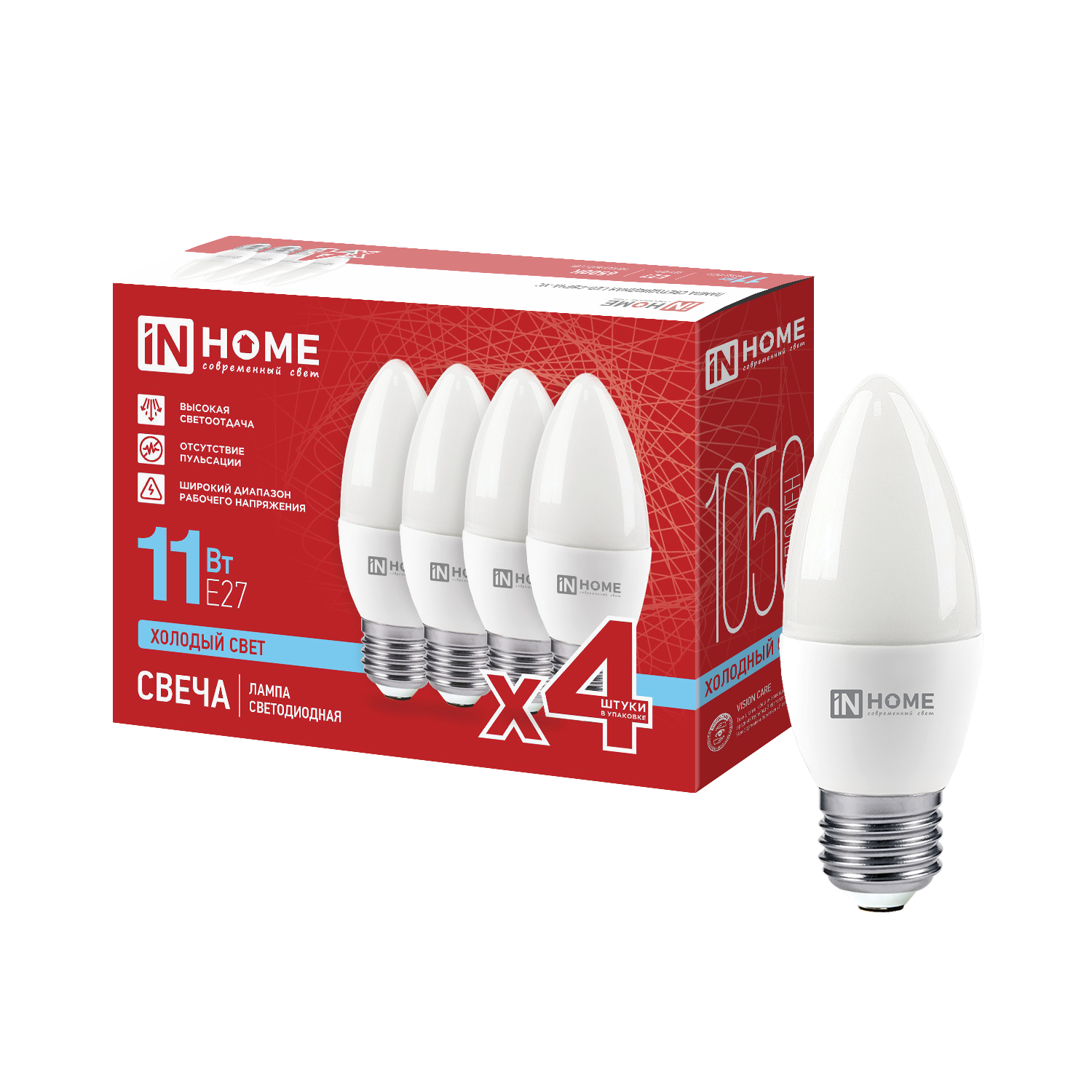Лампа светодиодная LED-СВЕЧА-VC 4PACK 11Вт 230В Е27 6500К 1050Лм (4шт./упак) IN HOME