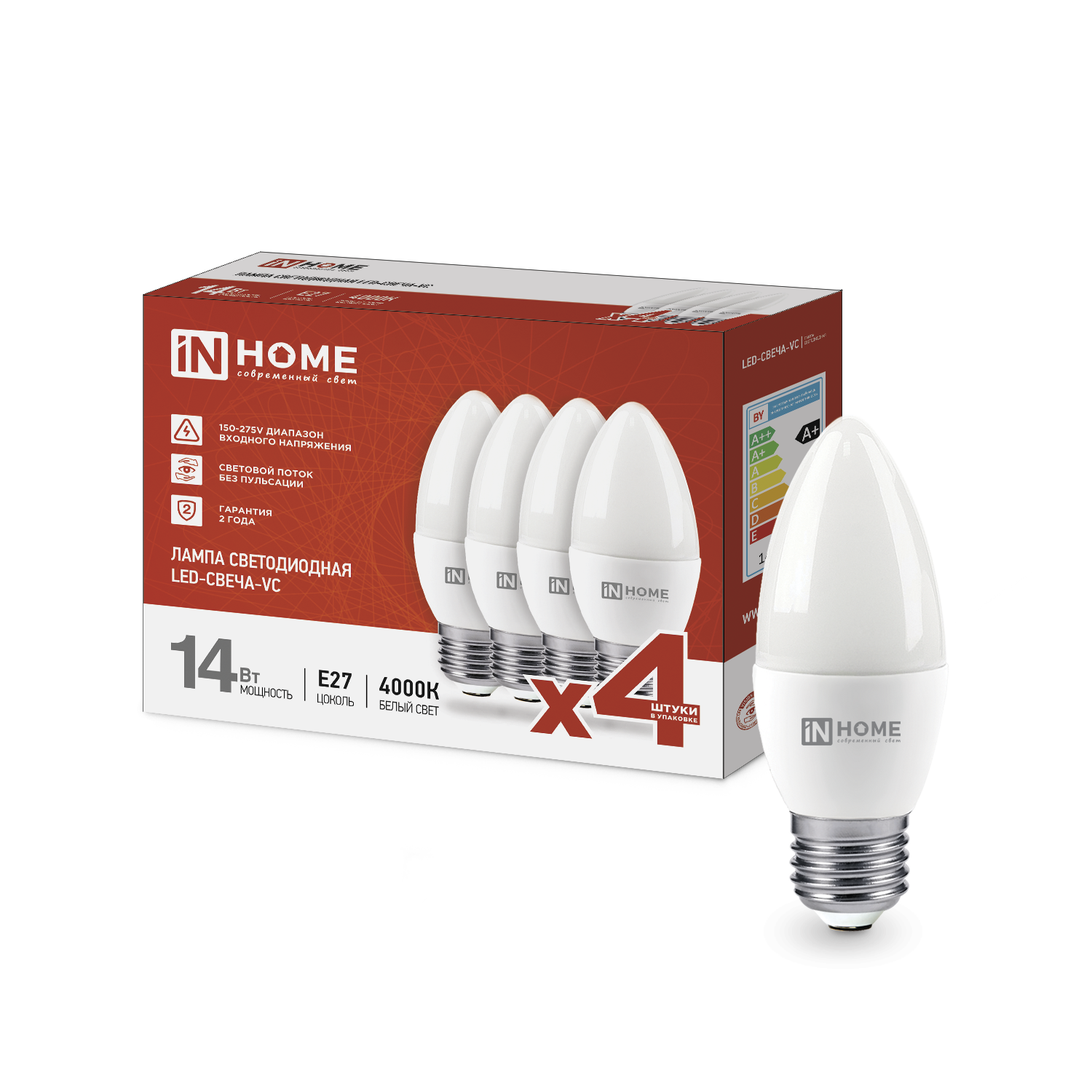 Лампа светодиодная LED-СВЕЧА-VC 4PACK 14Вт 230В Е27 4000К 1330Лм (4шт./упак) IN HOME