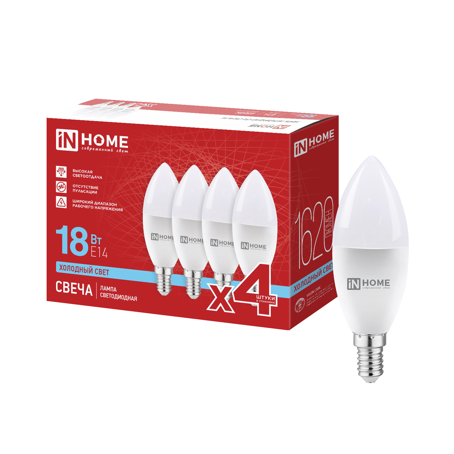 Лампа светодиодная LED-СВЕЧА-VC 4PACK 18Вт 230В Е14 6500К 1620Лм (4шт./упак) IN HOME