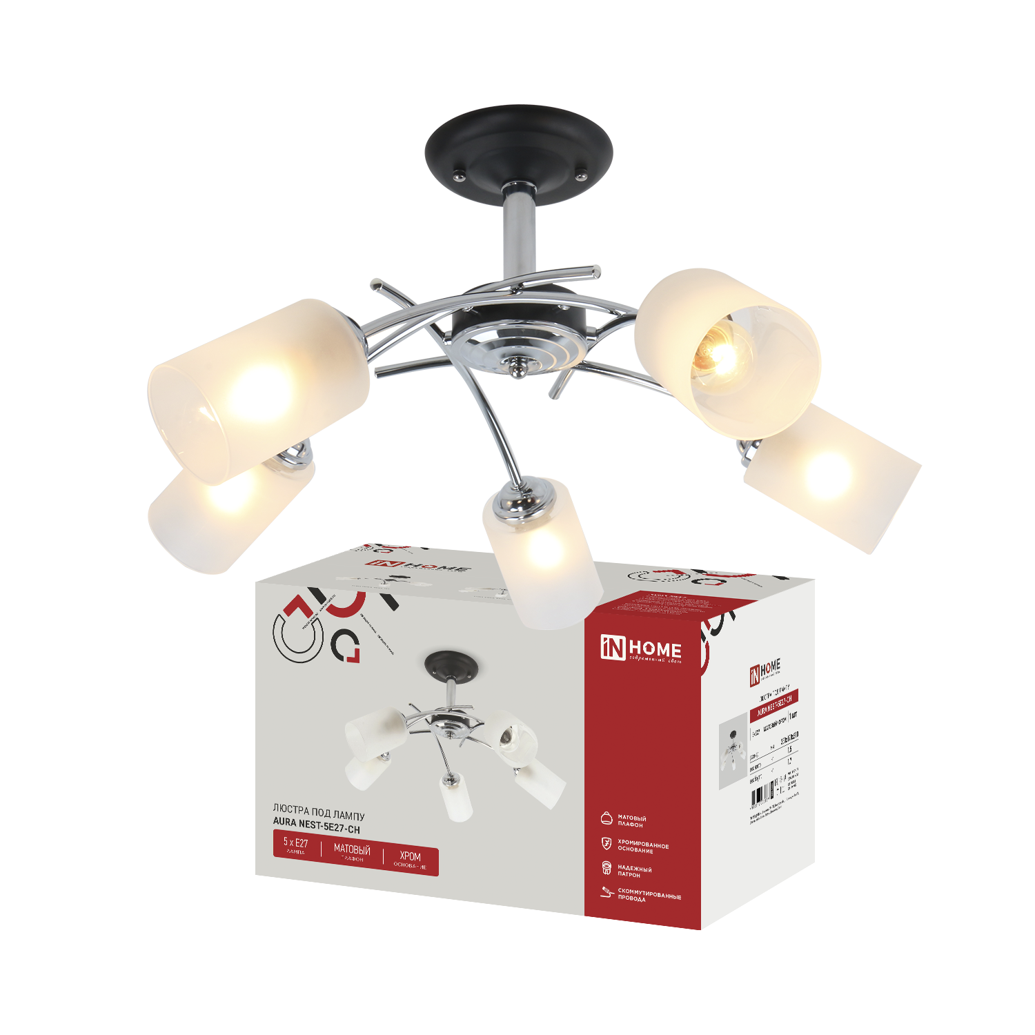 Люстра под лампу AURA NEST-5E27-CH 5хЕ27 матовый плафон хромированный корпус IN HOME