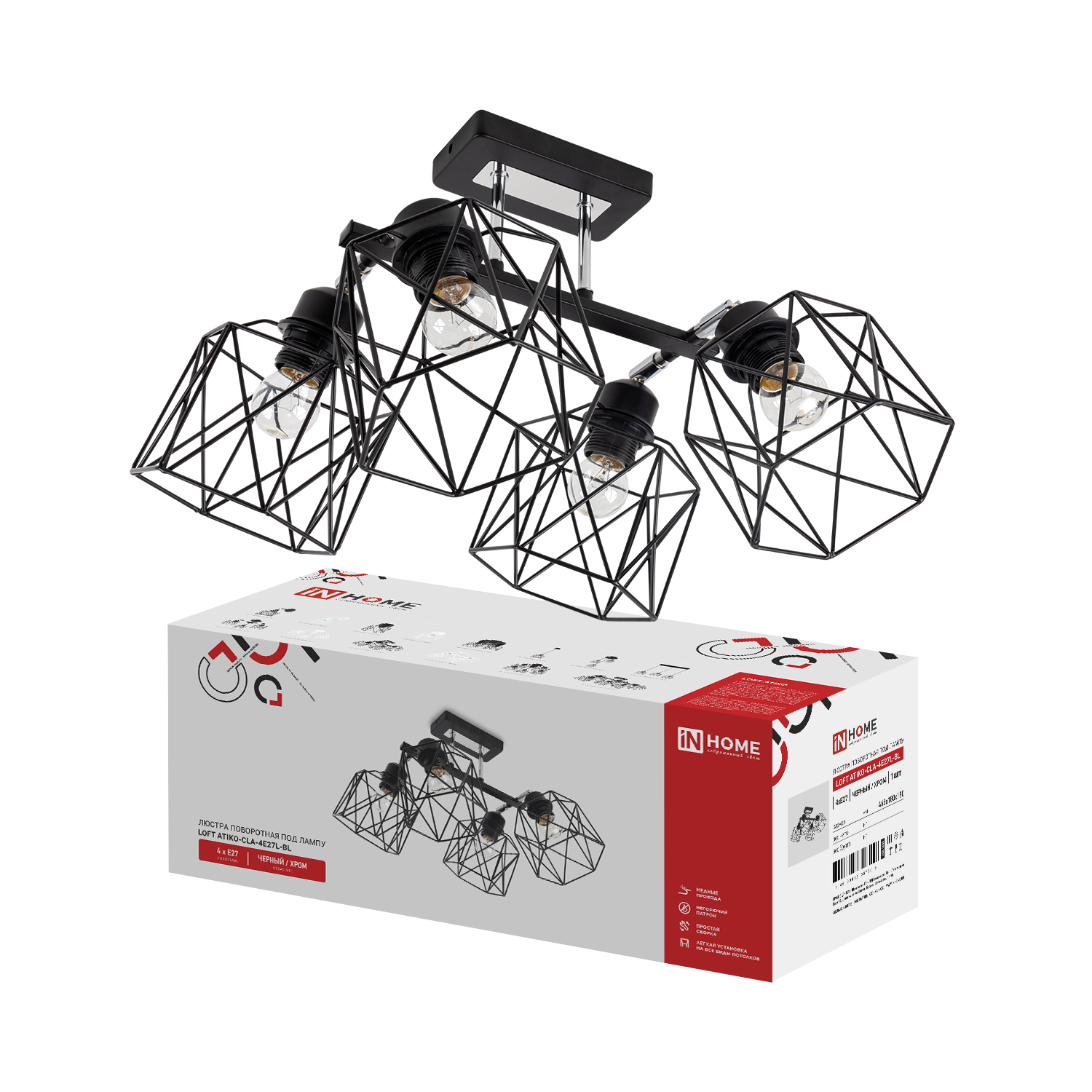 Люстра поворотная под лампу LOFT ATIKO-СLА-4E27L-BL 4хЕ27 черный, хром IN HOME