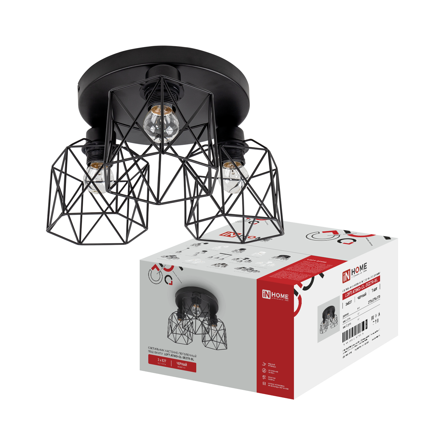 Светильник настенно-потолочный под лампу LOFT ATIKO-СL-3E27R-BL 3хЕ27 черный IN HOME