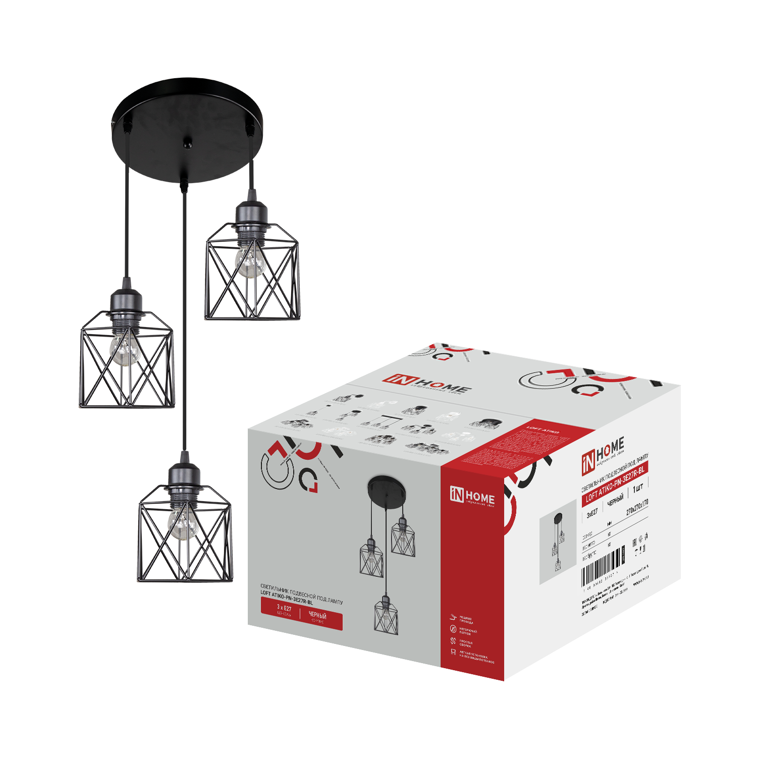 Светильник подвесной под лампу LOFT ATIKO-PN-3E27R-BL 3хЕ27 подвес 1м круглая база черный IN HOME