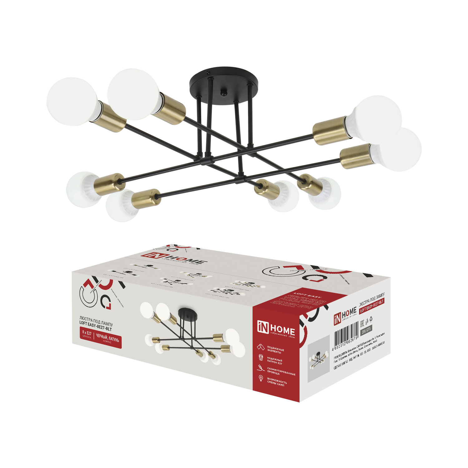 Светильник потолочный под лампу LOFT EASY-8E27-BLT 8хЕ27 черный, латунь IN HOME