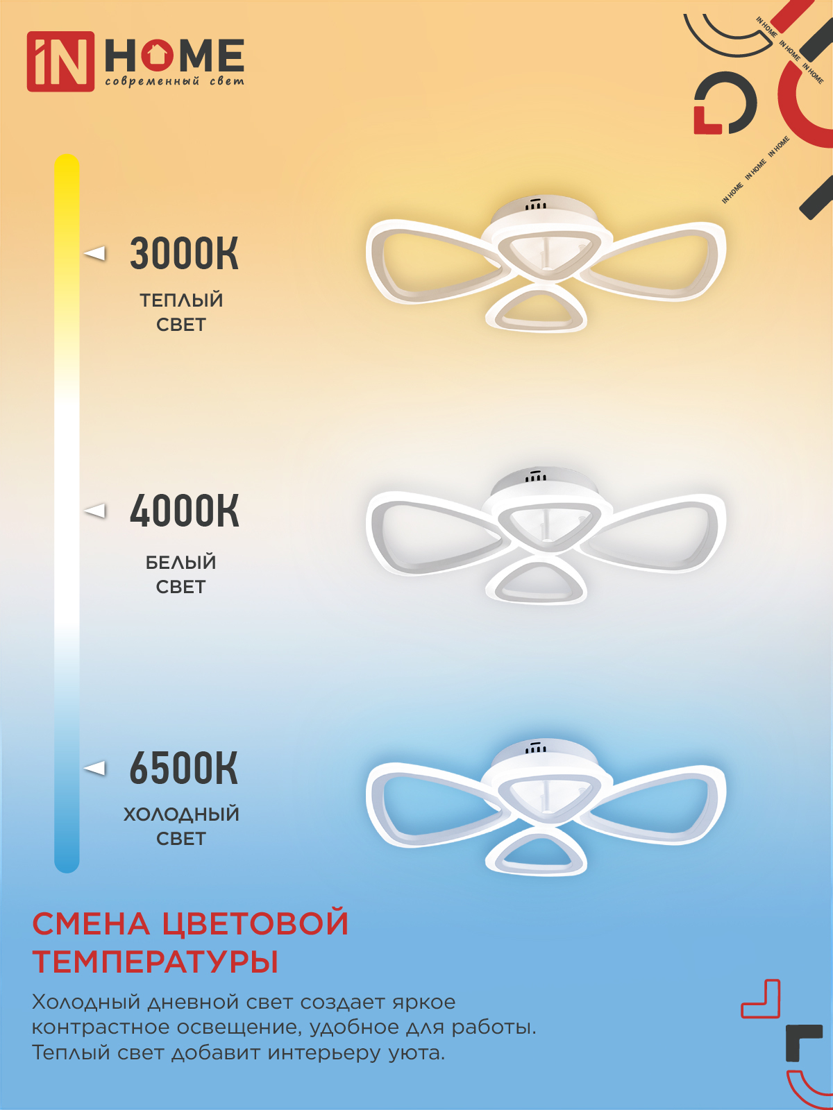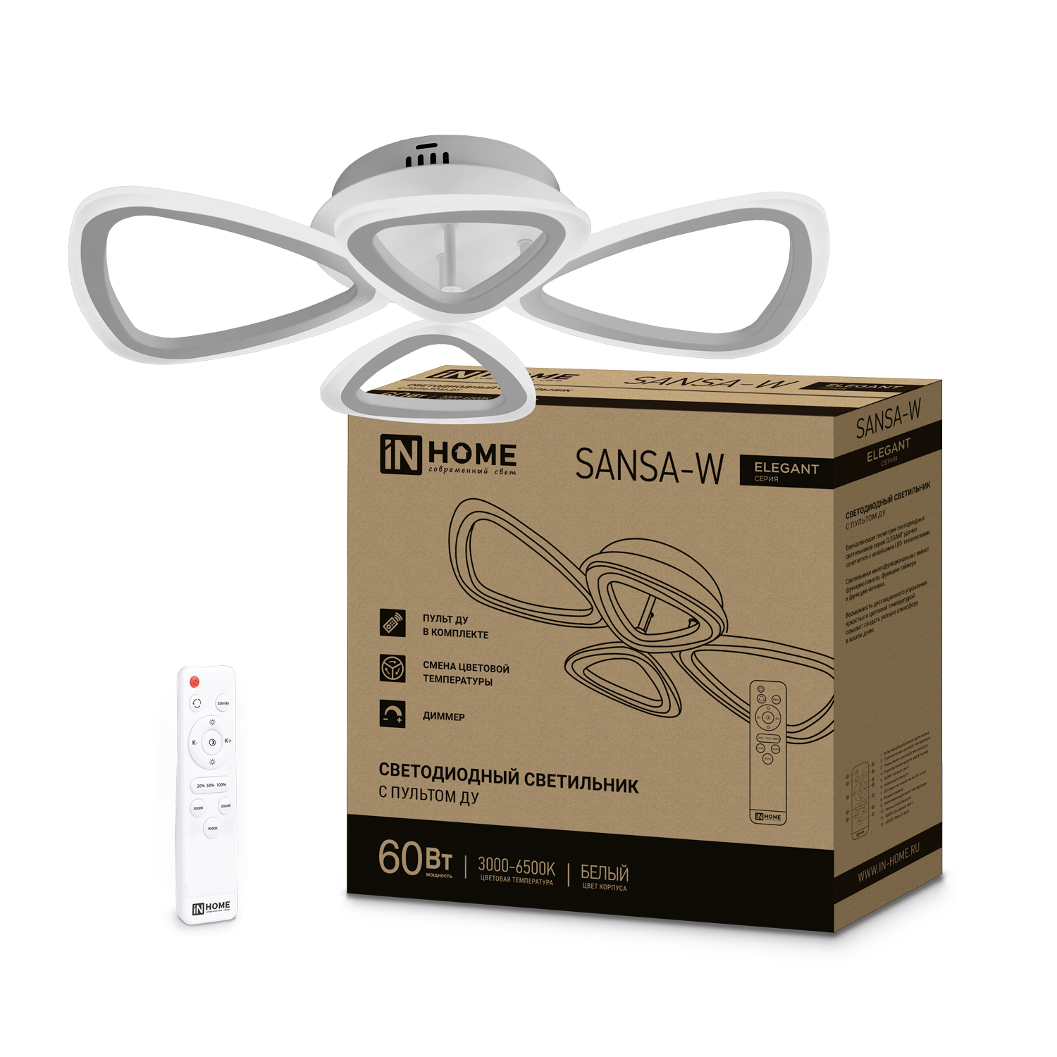 Серия ELEGANT от компании IN HOME современные технологии и эффектный дизайн. Потолочные светодиодные люстры модели SANSA выполнены в форме геометрического цветка с четырьмя лепестками белого цвета. Управлять светодиодной люстрой можно с помощью пульта дистанционного управления или с помощью выключателя. Предусмотрена возможность управления двумя светильниками с помощью одного пульта.