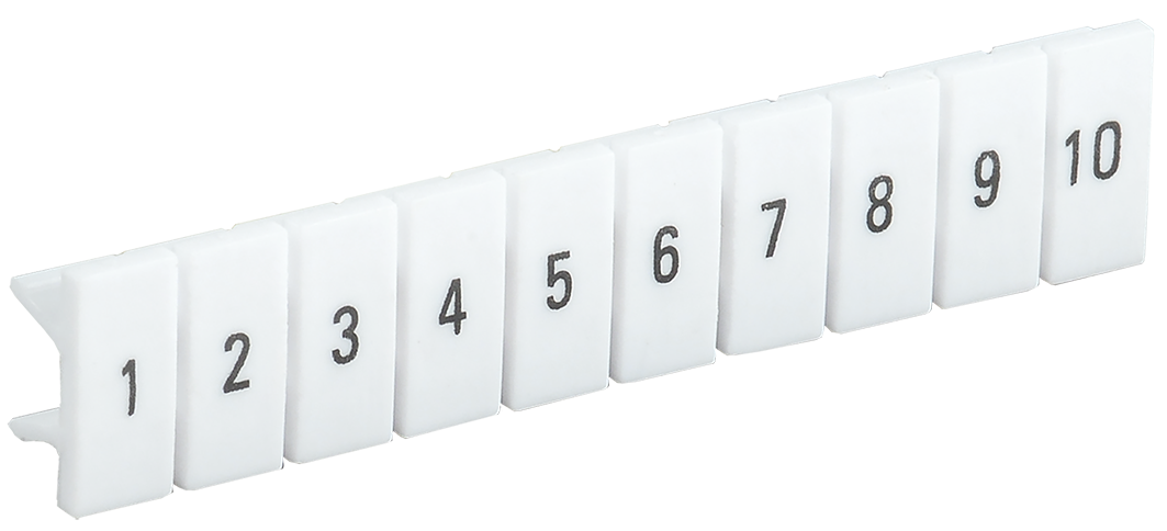 Устанавливаются в соответствующие пазы клеммы. Выполнены в виде пластин с десятью маркировочными площадками. Каждая площадка легко отсоединяется друг от друга.