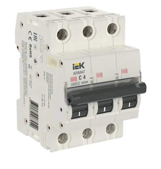 Автоматический выключатель M06N 3P 04А 6кА х-ка С ARMAT IEK имеет характеристику С, что означает, что он способен выдерживать ток короткого замыкания до 6 кА. Это обеспечивает надежную защиту электрических цепей от перегрузок и коротких замыканий.