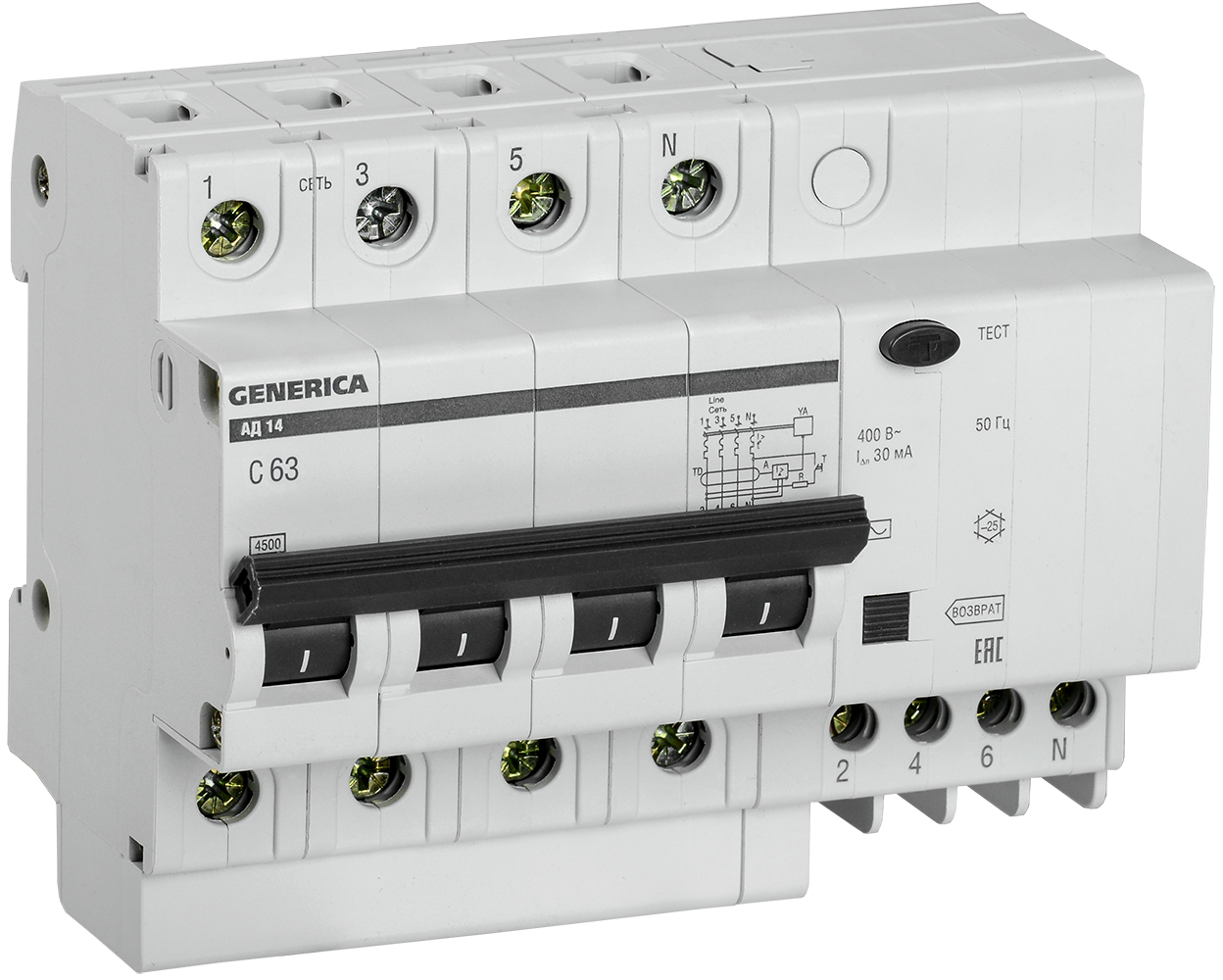 Дифференциальный автомат АД14 4Р 63А 30мА GENERICA