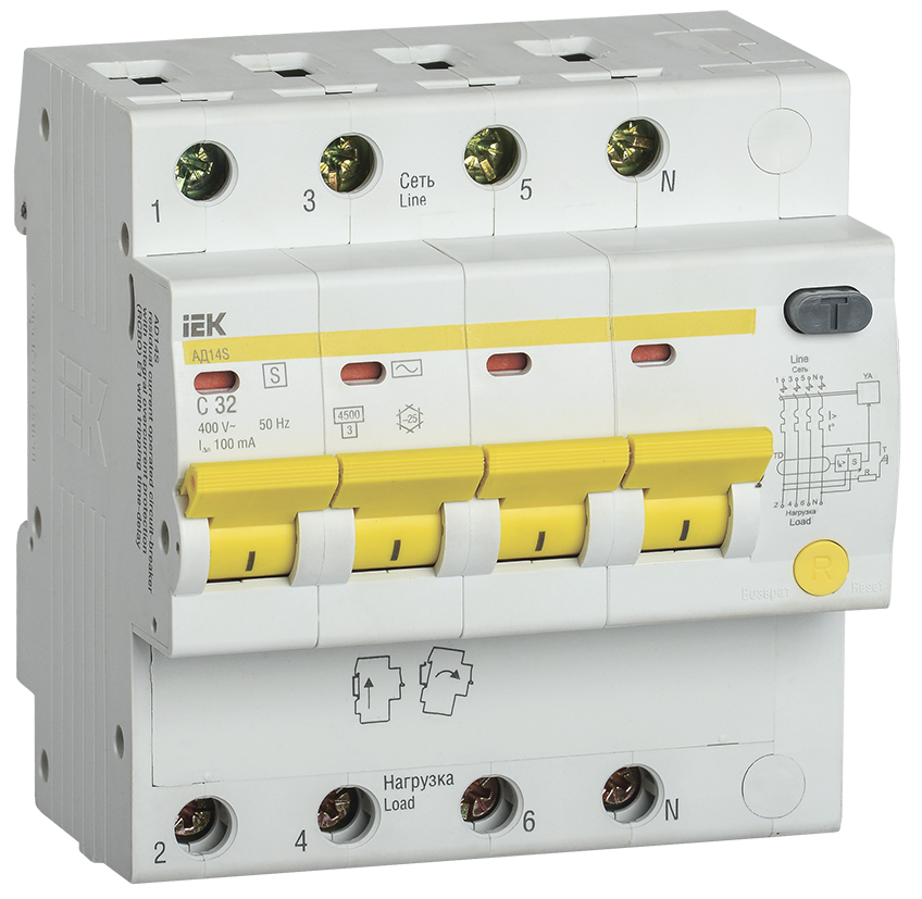 Дифференциальный автомат селективный АД14S 4Р 32А 100мА IEK имеет ряд других преимуществ, таких как усовершенствованная дугогасительная система, встроенная защита от длительных перенапряжений сети, стандартное присоединение нагрузки и двойное присоединение сети, визуальная индикация состояния контактов и светодиодная индикация наличия напряжения на клеммах "Нагрузка".