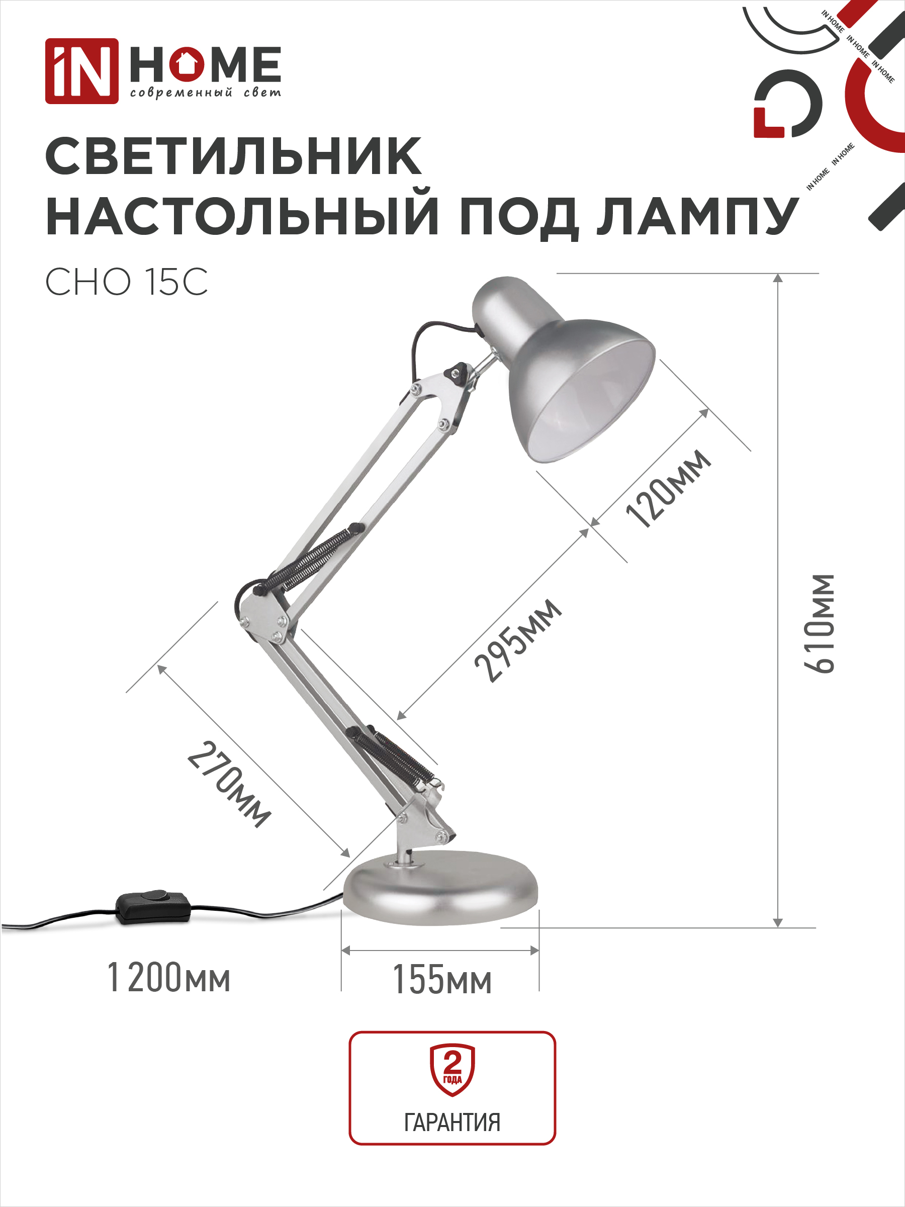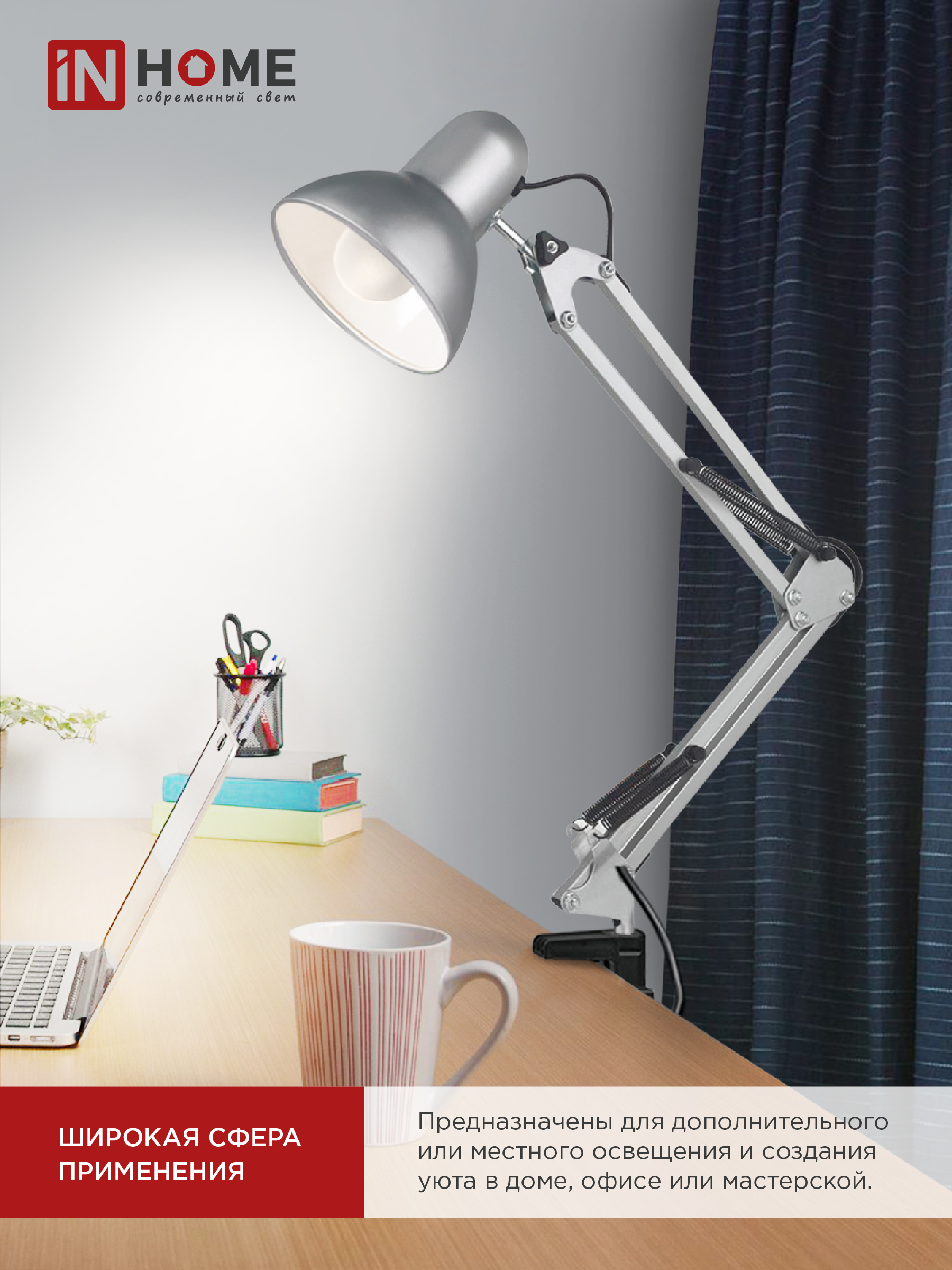 Светильник настольный под лампу на основании + струбцина СНО 15С-E27 230В СЕРЕБРО IN HOME