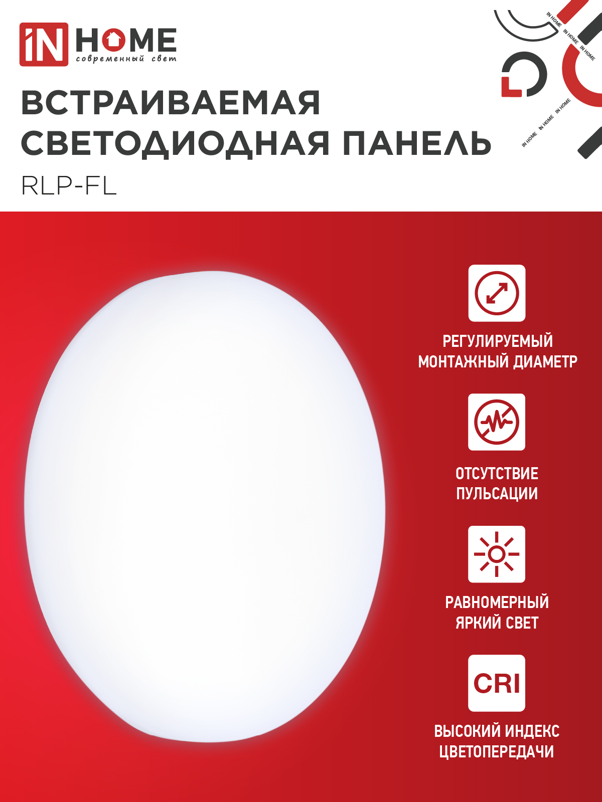 Панель светодиодная встраиваемая безрамочная RLP-FL 10Вт 230В 6500К 900Лм 100мм с регулируемым монтажом 45-80мм белая IP20 IN HOME