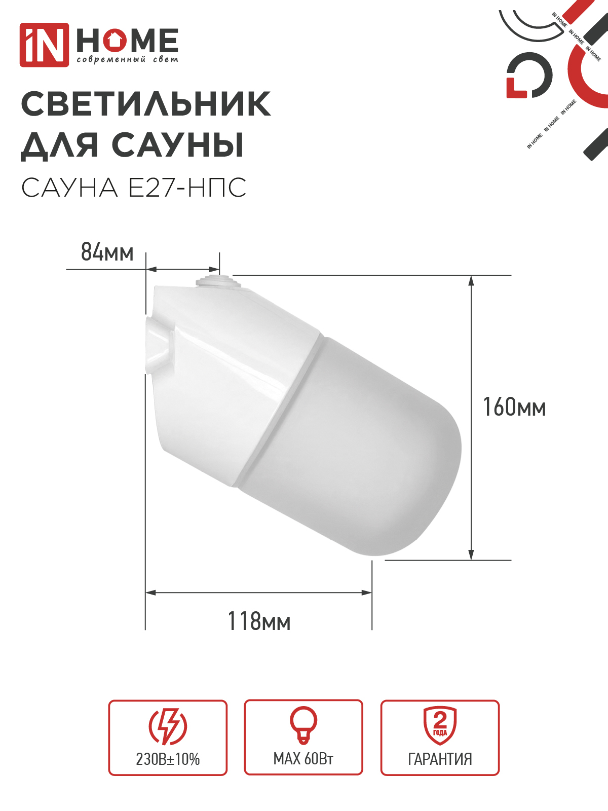 Светильник для сауны наклонный САУНА E27-НПС пластик, стекло IP65 101x160мм белый IN HOME