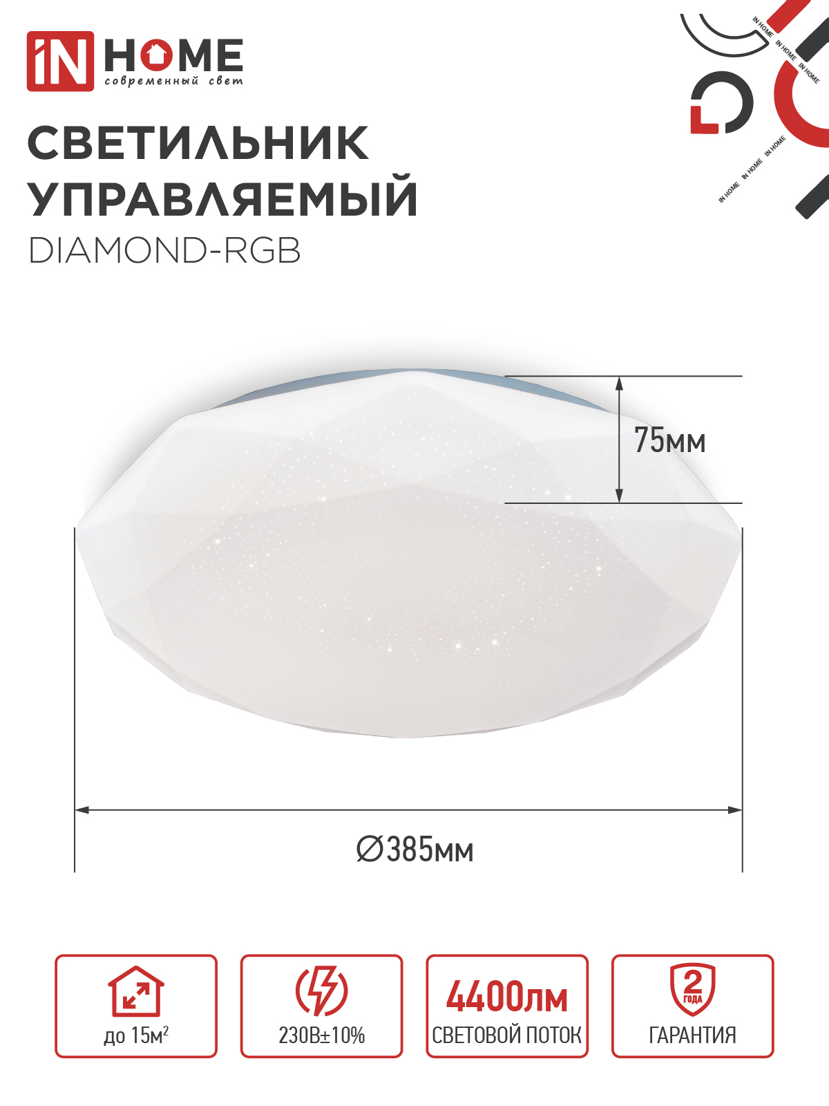 Используйте таймер отключения, и через 30 минут светильник выключится сам, что поможет сэкономить электроэнергию. Номинальный срок службы светильника - не менее 30 000 часов, а гарантия на него составляет 2 года. Светильник светодиодный накладной потолочный COMFORT DIAMOND-RGB - это не только источник света, но и стильный элемент декора, который украсит любое помещение и создаст уютную атмосферу.