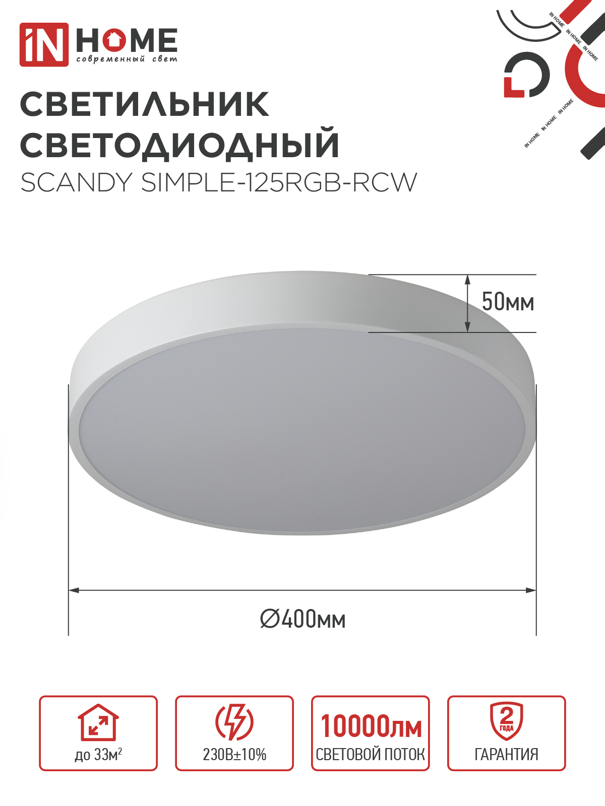 Светильник светодиодный SCANDY SIMPLE-125RGB-RCW 125Вт 230В 3000-6500K 10000Лм 400x50мм пульт ДУ белый IN HOME