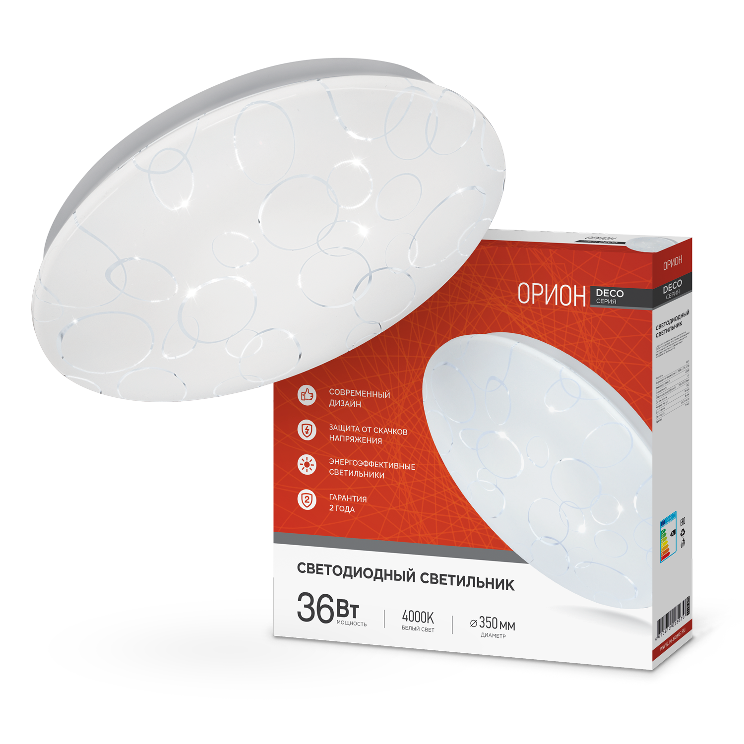 Светодиодный светильник круглой формы ОРИОН серии DECO от ТМ INhome в классическом белом корпусе с нейтральным абстрактным рисунком удачно впишется в любой современный интерьер. Линейка светильников ОРИОН представлена в трех размерах от 190 до 350 мм. Несколько вариаций мощности (в диапазоне от 12 Вт до 36 Вт) позволяют подобрать оптимальный осветительный прибор, в зависимости от конфигурации и габаритов помещения.