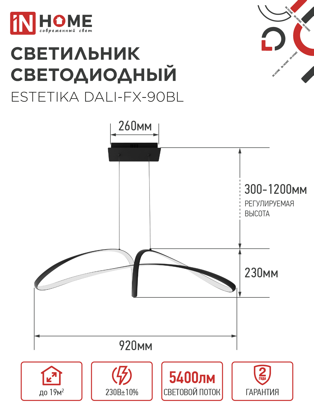 Светильник светодиодный ESTETIKA DALI-FX-90BL 90Вт 230В 3000-6500K 920х245x230мм 1.2м трос ДУ черный IN HOME