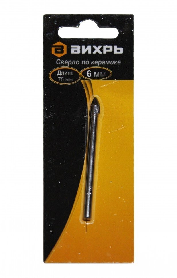 Сверло по керамике и стеклу ВИХРЬ 6 мм. Материал обработки: стекло/кафель. Тип хвостовика: цилиндрический. Тип: копьевидное. Диаметр: 6 мм. Длина: 75 мм.