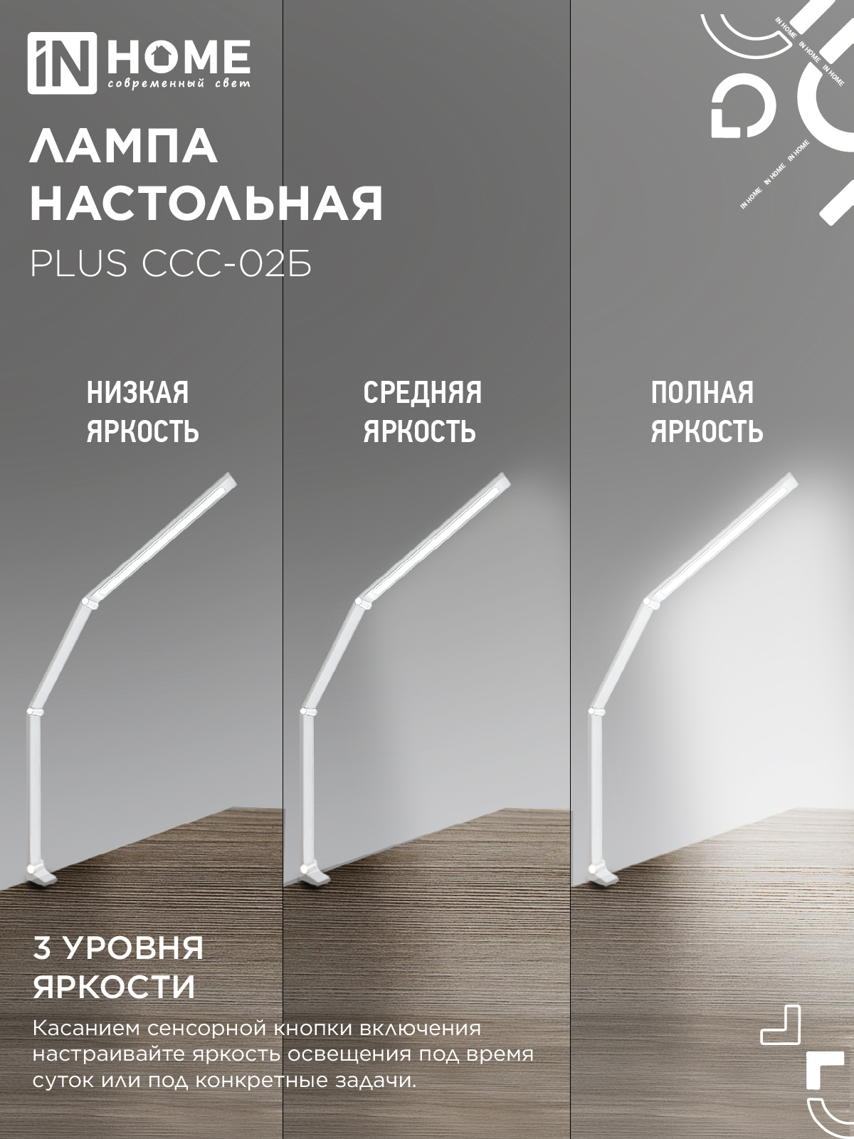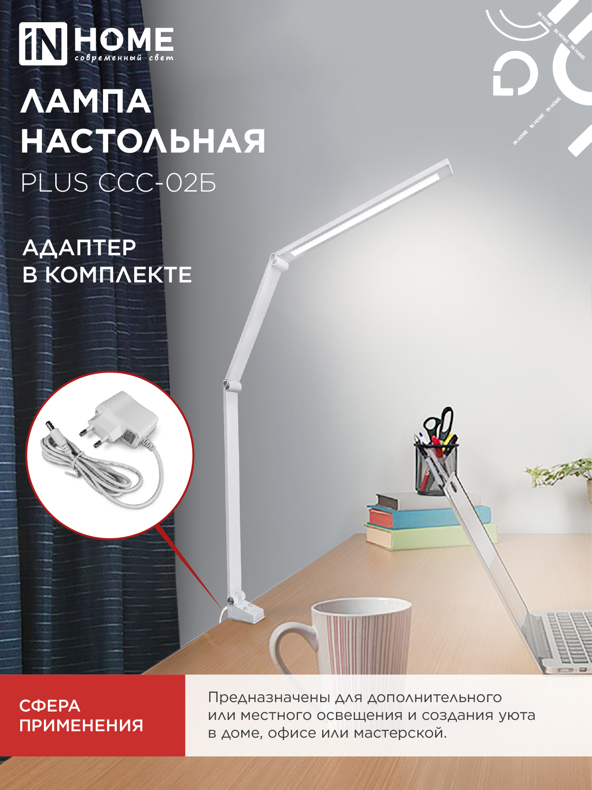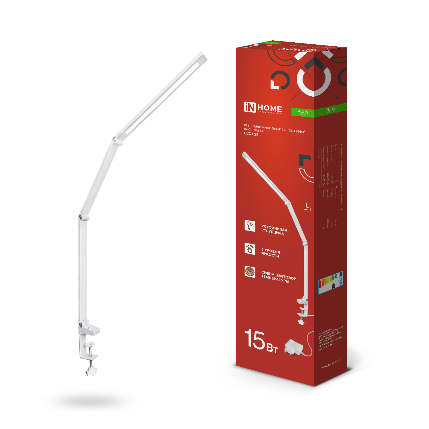 Светильник настольный светодиодный PLUS ССС-02Б 15Вт 3000-6500К 600Лм USB, с адаптером, струбцина БЕЛЫЙ IN HOME