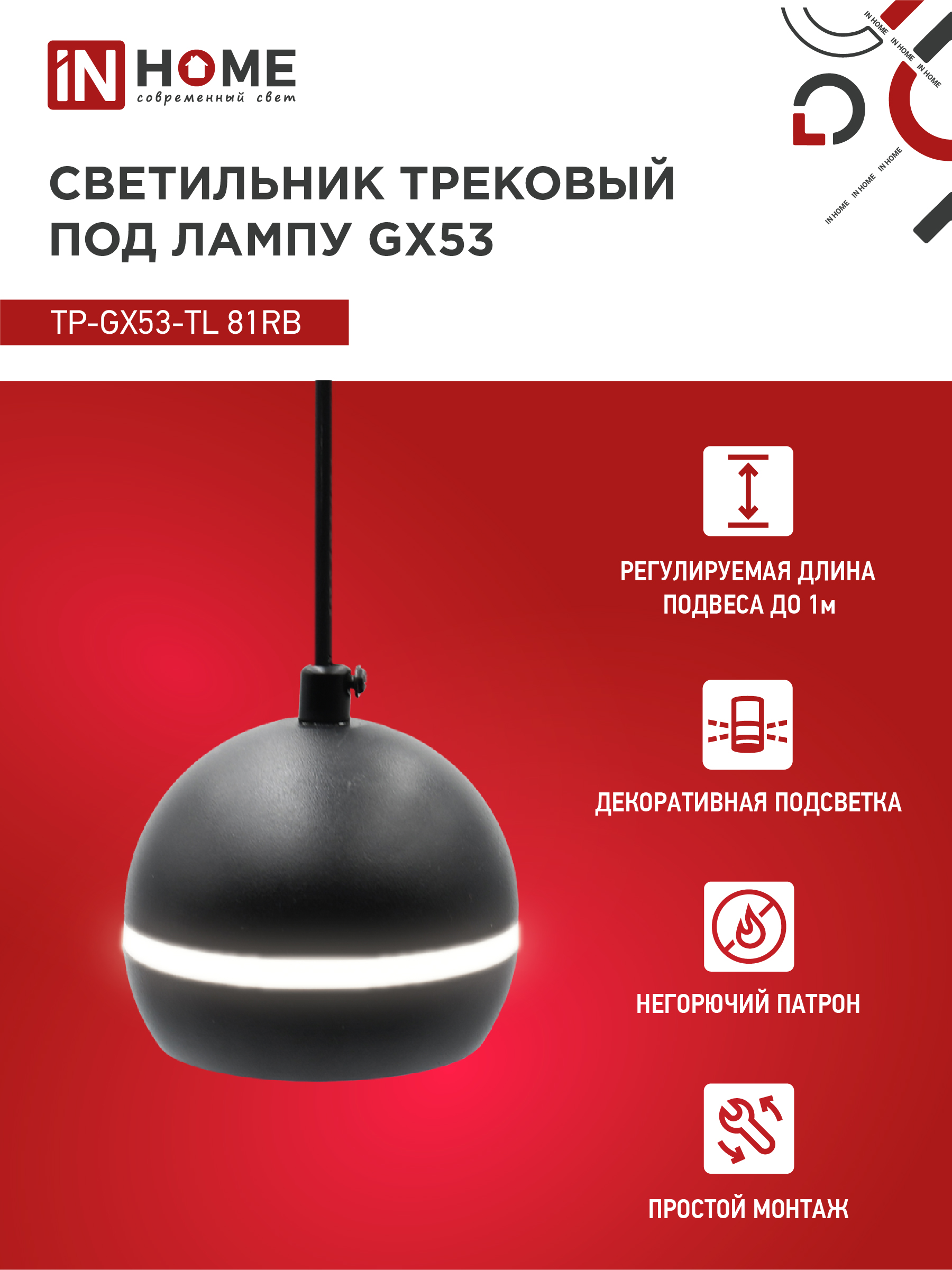 Светильник трековый подвесной TP-GX53-TL 81RB под лампу GX53 с подсветкой 70 мм, шнур 1м, черный IN HOME