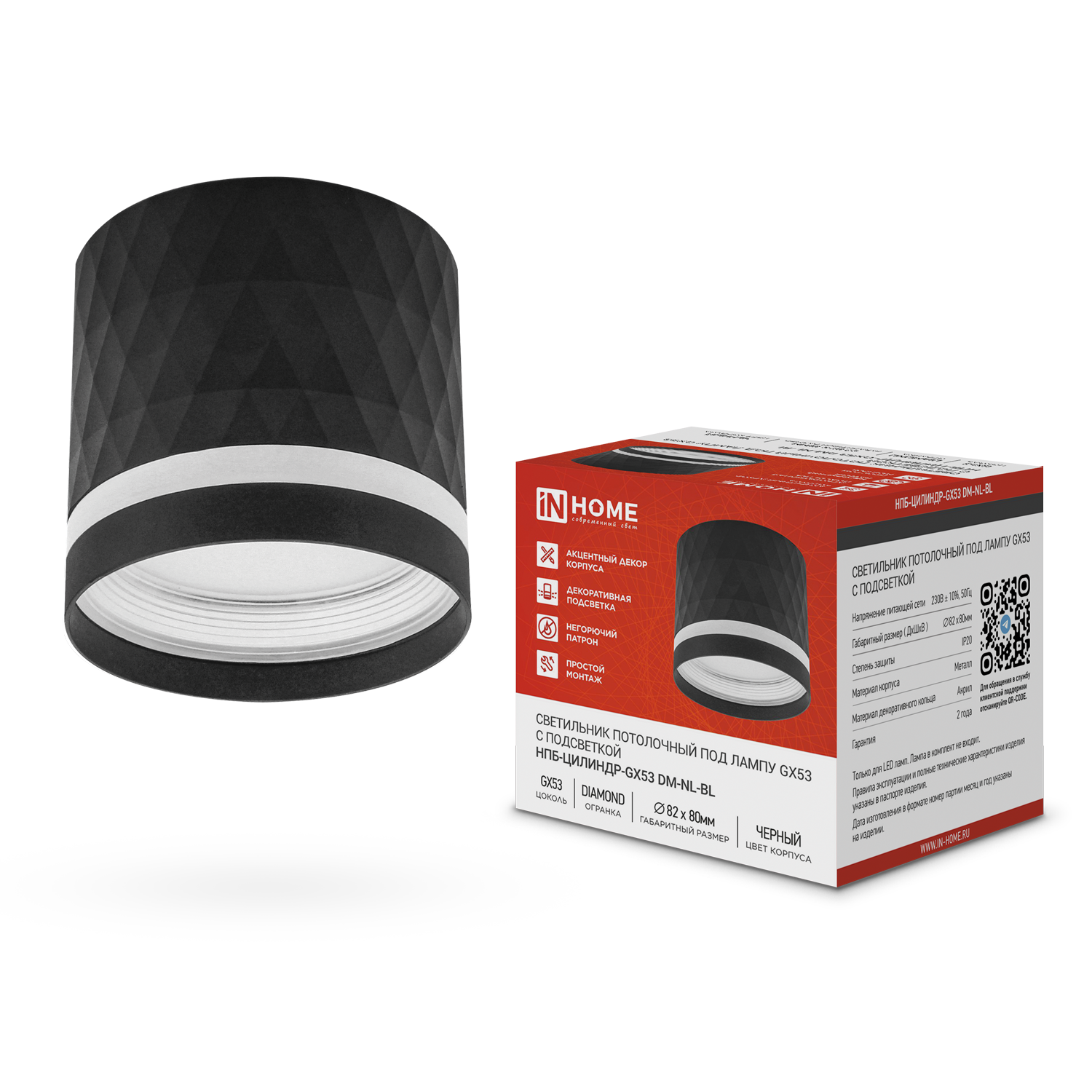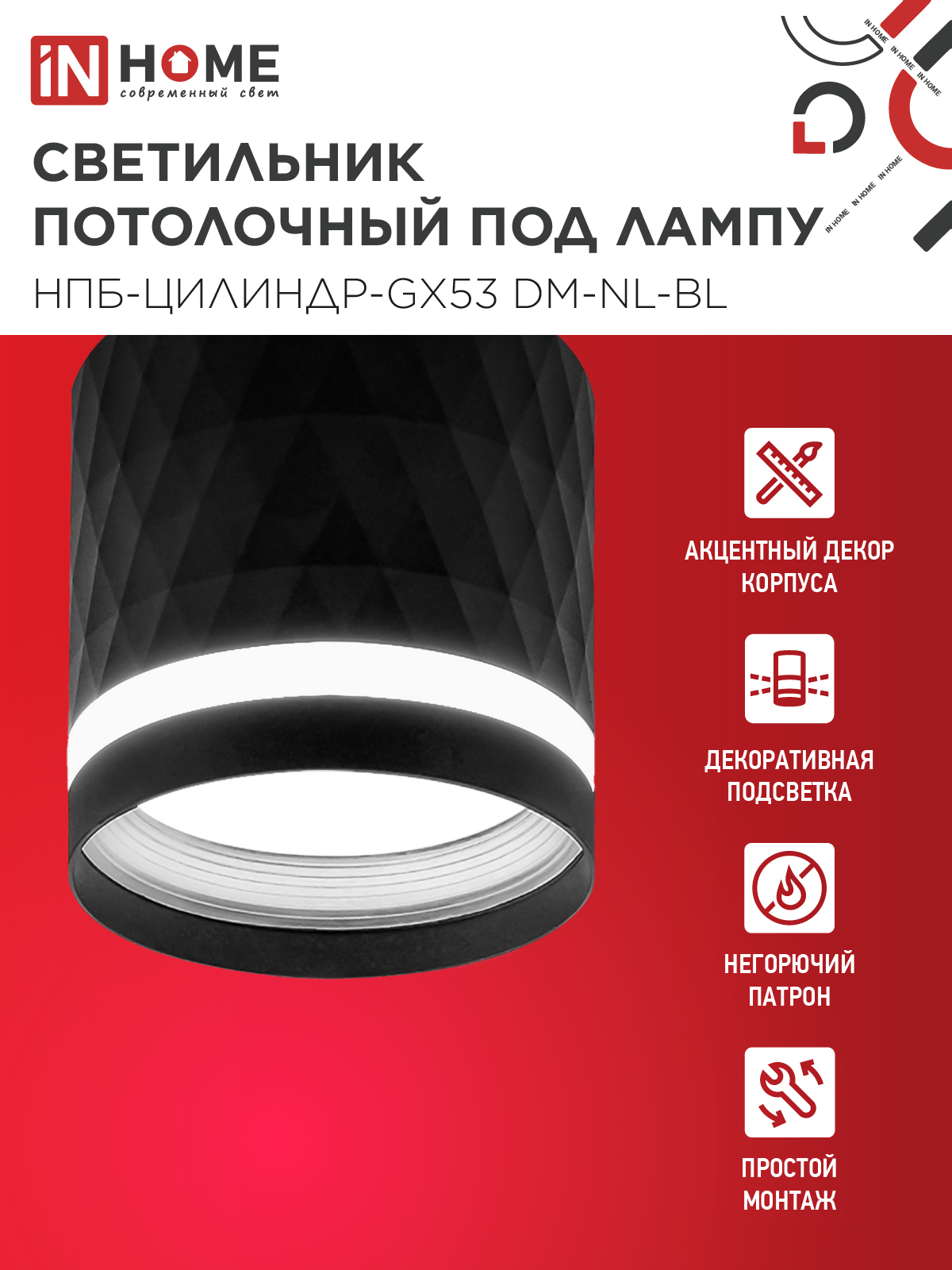 Светильник потолочный НПБ-ЦИЛИНДР-GX53 DM-NL-BL с подсв. 82x80мм черный IN HOME