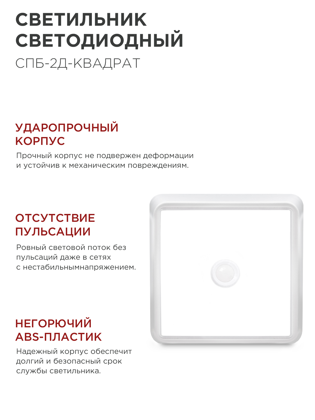 Светильник СПБ-2Д-КВАДРАТ обладает высоким коэффициентом мощности и характеризуется стабильной работой в широком диапазоне значений входного напряжения (207 – 253В). Светильник изготовлен из безопасных и современных материалов, не подверженных старению, пожелтению, деформациям, а также воздействию высоких температур. Не содержит вредных, токсичных и легковозгораемых веществ. Матовый рассеиватель обеспечивает ровное, комфортное для глаз освещение, с полным отсутствием мерцания.Основные достоинства изделия