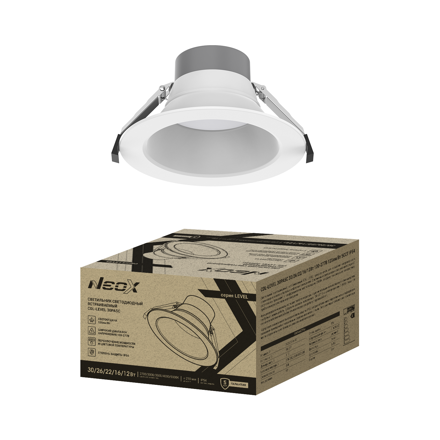 Светильник встраиваемый светодиодный CDL-LEVEL 30PA5C 30/26/22/16/12Вт 100-277В 125Лм/Вт 5ССТ 5лет 210мм NEOX