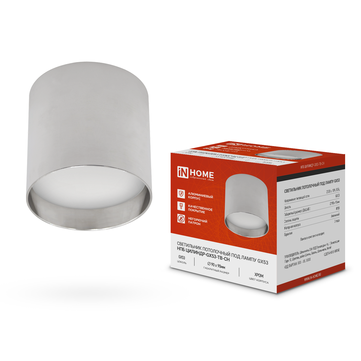 Светильник потолочный НПБ ЦИЛИНДР-GX53-TB-CH под лампу GX53 90х90мм хром IN HOME