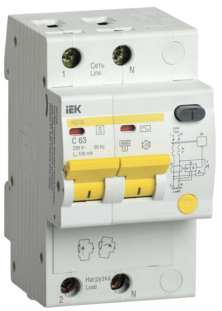 Дифференциальный автомат селективный АД12S 2Р 63А 100мА IEK