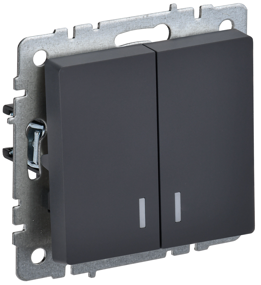 Двухклавишный выключатель с подсветкой BRITE IEK графит имеет максимальную нагрузку 10А, что позволяет использовать его для большинства видов освещения. Он обладает высокой надежностью и долговечностью, так как изготовлен из качественных материалов.