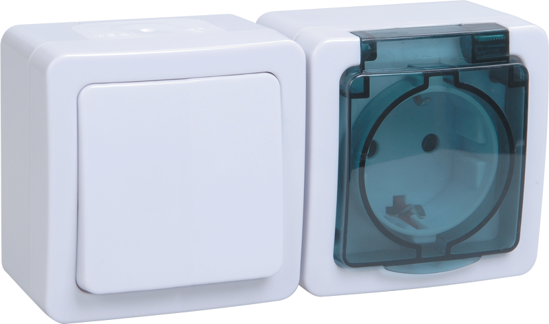Выключатель одноклавишный с розеткой с заземлением ГЕРМЕС PLUS IEK накладной IP54