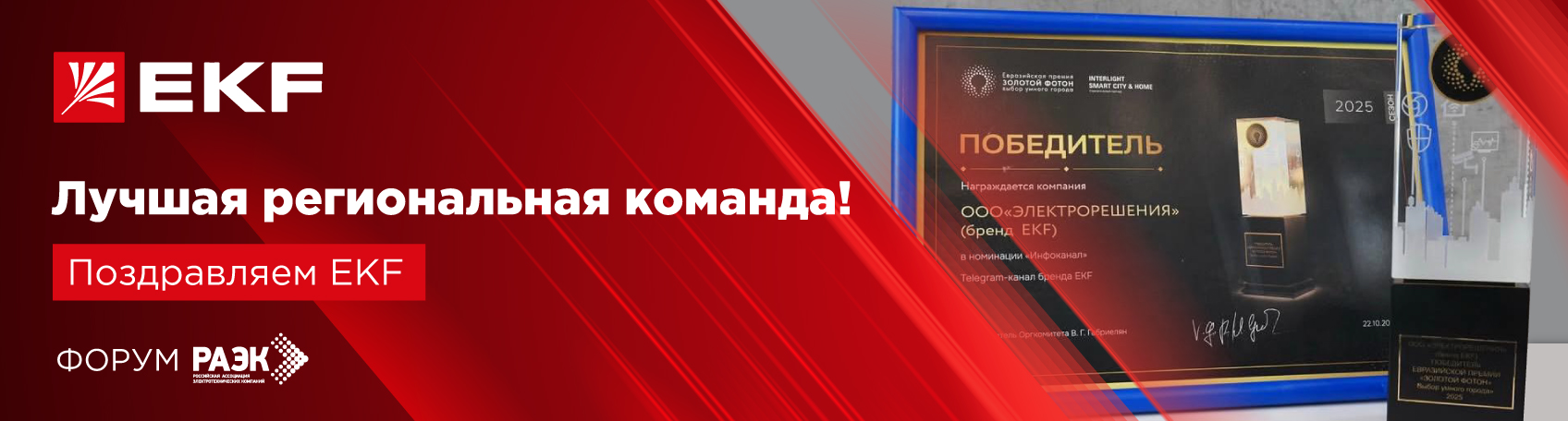 Компания «Электрорешения» (официальный представитель EKF в России) в очередной раз подтвердила свой высокий статус, став победителем престижной премии РАЭК Awards 2025.И самое ценное, что эту награду присудили по результатам опроса партнеров и коллег по ассоциации. Это оценка ежедневной работы бренда!